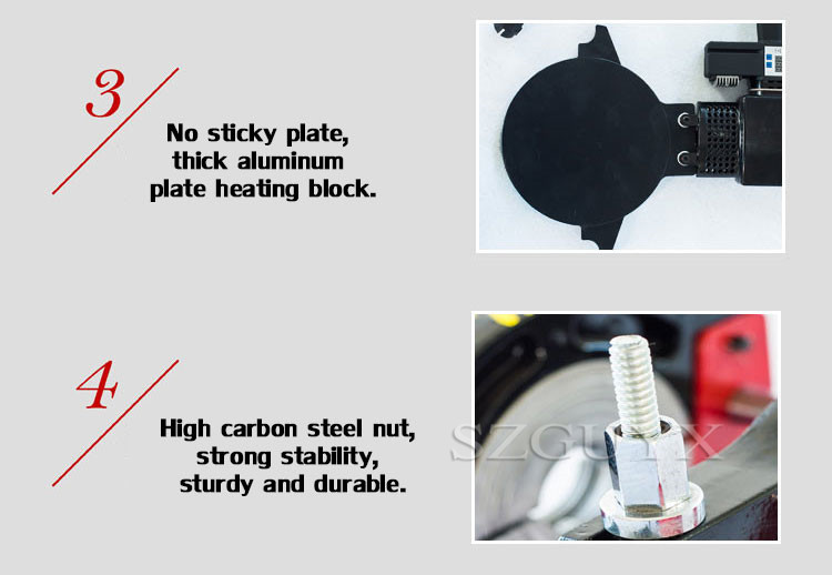 Product parameters Welding range (mm): (50) 63, 75, 90, 110, 125, 140, 160 Docking deviation: ≤0.2mm Temperature deviation: ±3 °C Temperature control range: 0~ 300°C Ambient temperature: -40~40°C Time required to reach the soldering temperature: <20min Applicable materials: PE, PPR, PB, PVDF Packing size: 50*43*42 (cm) Gross weight: 32.3kg Heating plate weight: 2.8kg Frame weight: 16kg Milling cutter weight: 6kg Heating plate power: 1kw/220v Milling cutter power: 0.9kw/220v