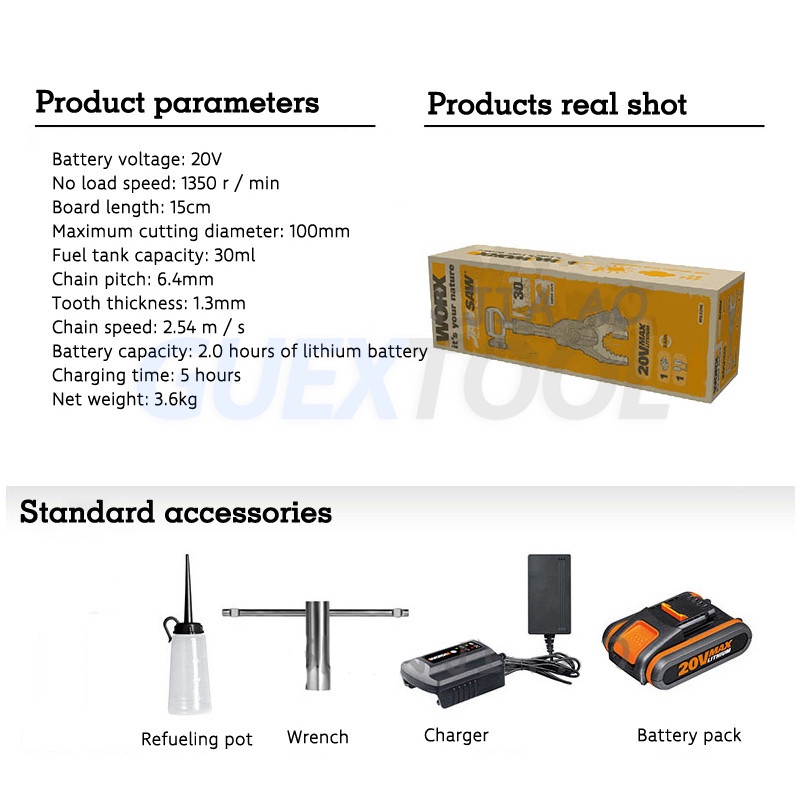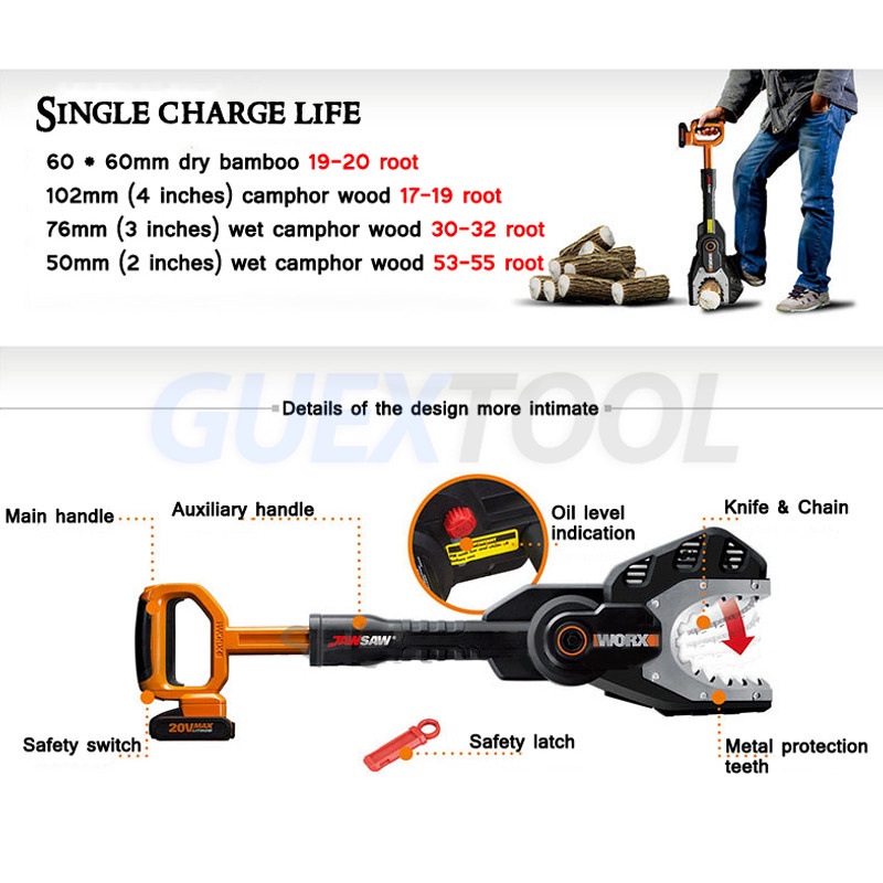 Brand Name: GUYX Power Type: : Electric Features: Telescopic handle Battery voltage: 20V Chain speed: 2.54 m/s No-load speed: 1350 rpm Model: WG329E Board length: 15cm Tooth thickness: 1.3mm Maximum cutting diameter: 100mm Chain pitch: 6.4mm