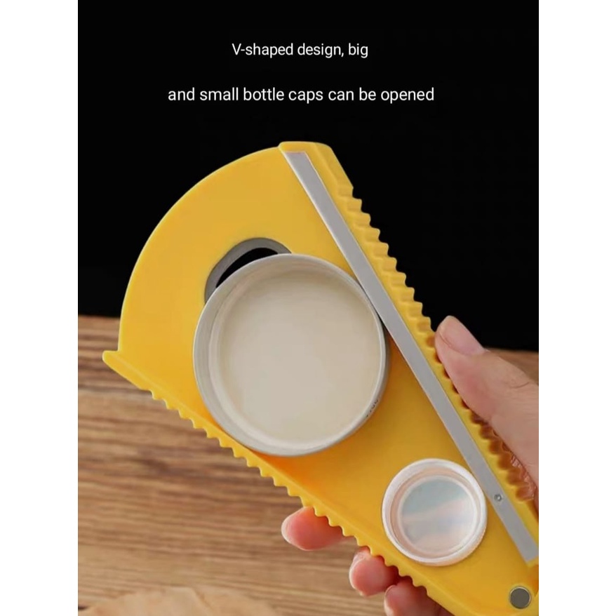 - design in a V shape so that can open cap of different sizes