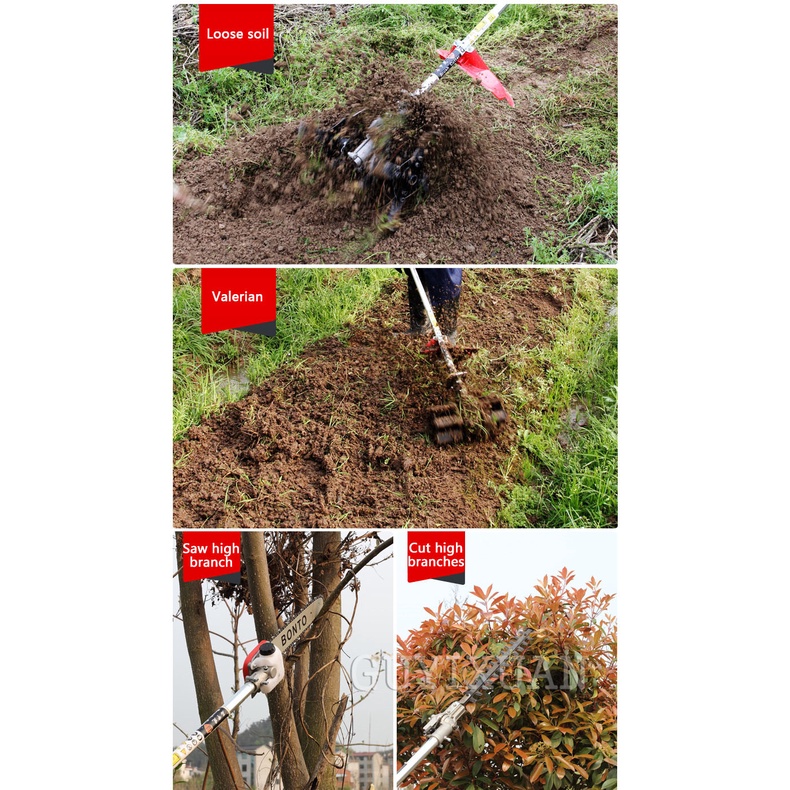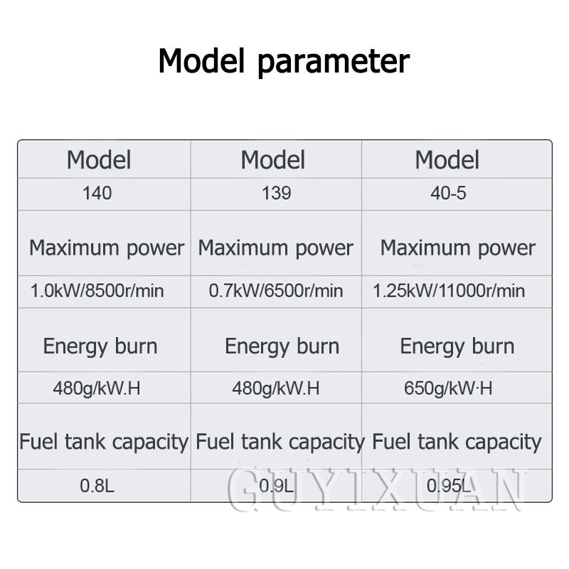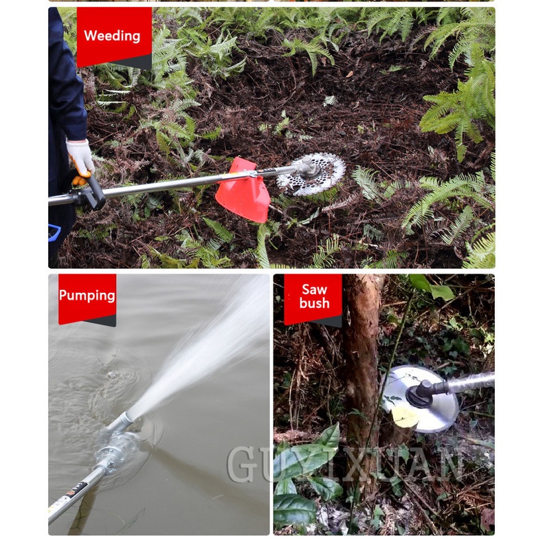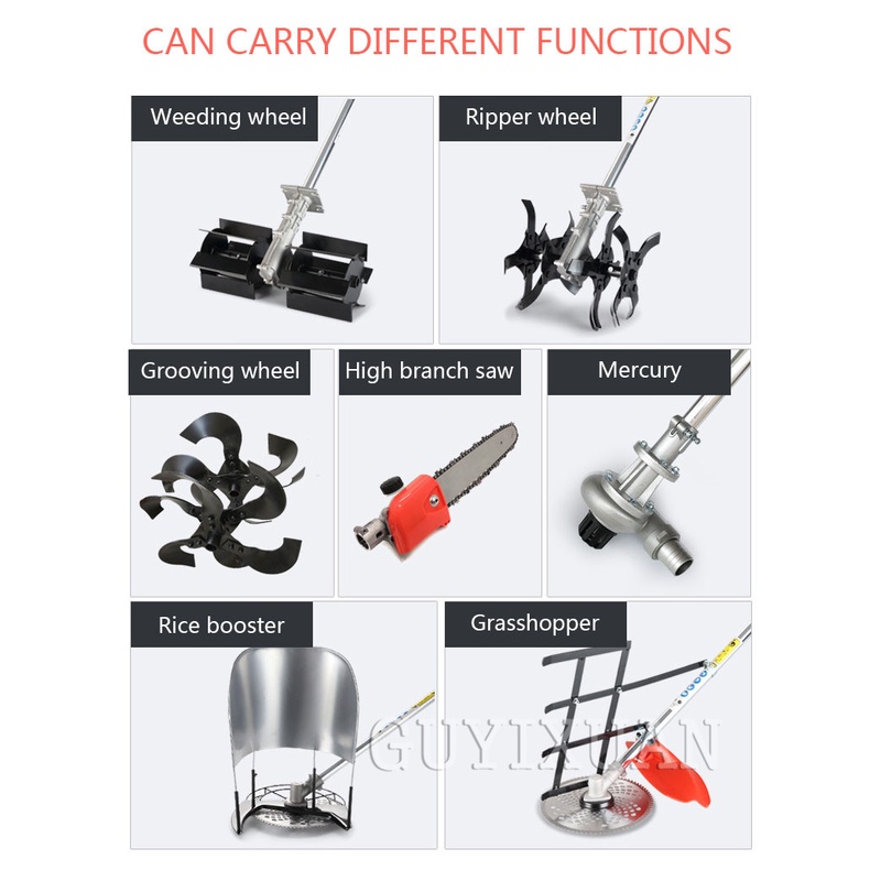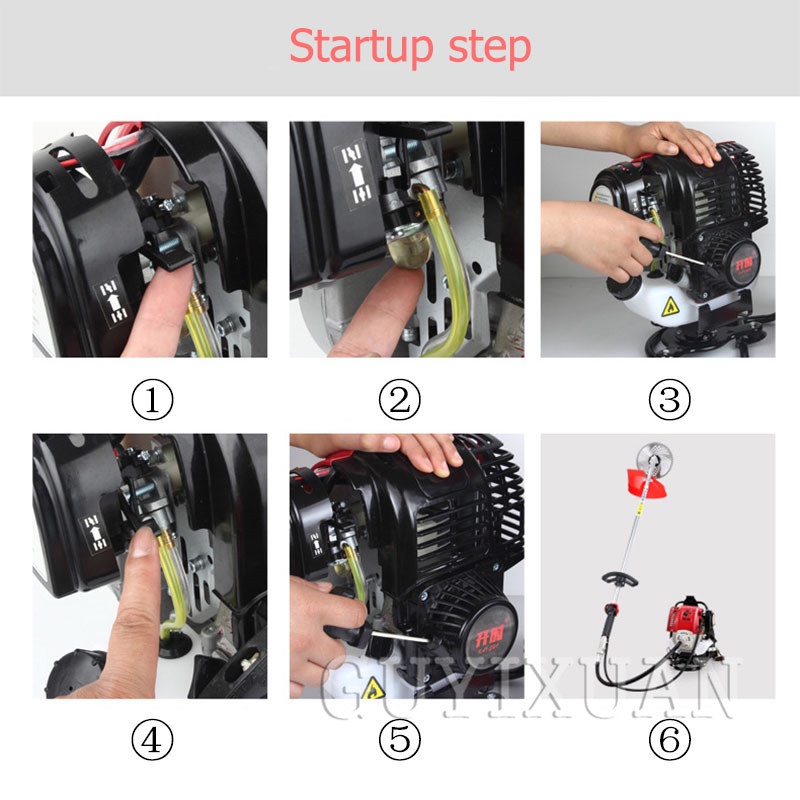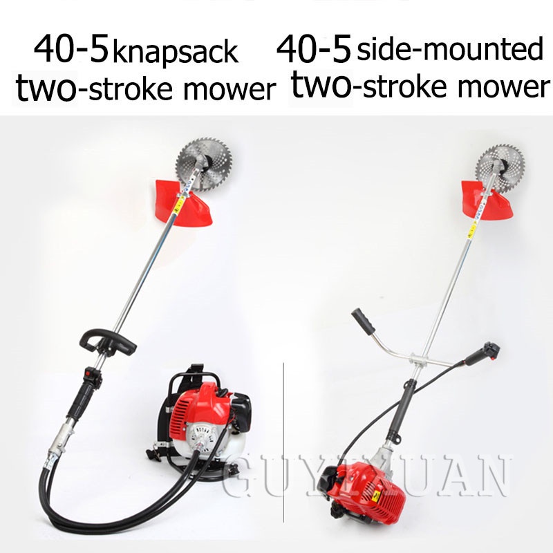 Brand Name : GUYX Certification : CE Origin : CN(Origin) Pruning Tool Type : Lawn Shears Pruner Type : Bypass Model Number : 40-5 Finishing : Not Coated Material : Metal Product parametersProduct Name: Lawn Mower Model: 40-5 Specifications: 40-5 piggyback / 40-5 side hanging Maximum power: 1.25kw/11000r/min Fuel consumption: 650g/KW.H Fuel tank volume: 0.95L Material: aluminum alloy Scope of application: mowing Applicable places: garden Power type: 2 stroke1, the damper push rod pushes up 2, squeeze the oil bag to make the oil bag full of oil 3, pull the start handle 4. When the machine hears the ignition sound, the damper pusher pushes down. 5, once again pull the pull handle to start 6, start completedAdd the following work heads to achieve different job functions, please contact customer service to purchase
