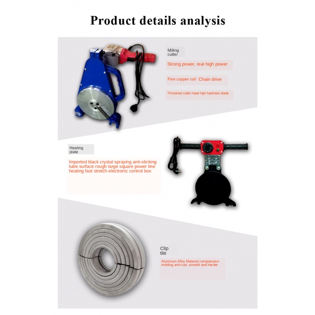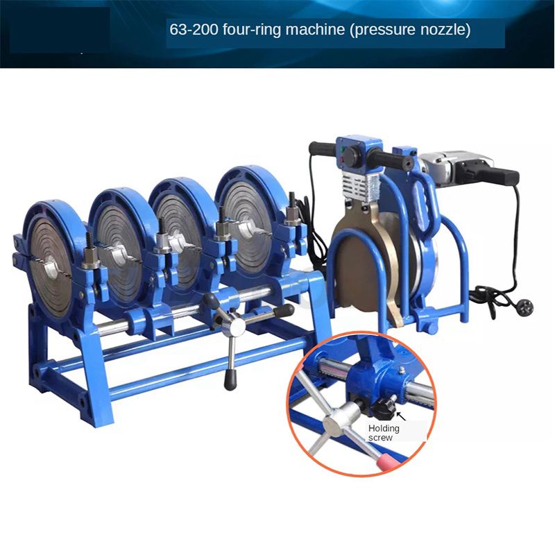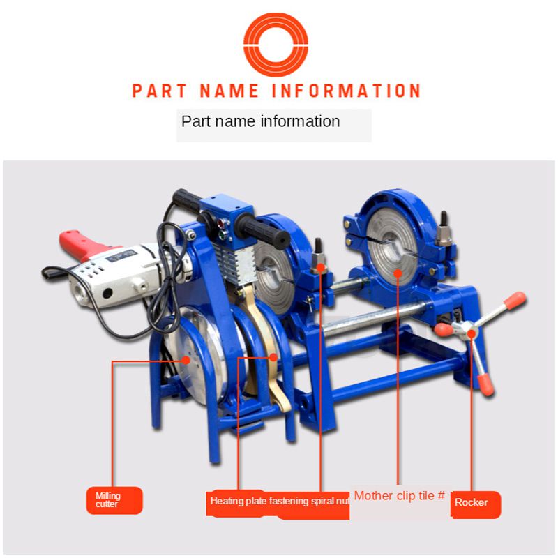 Product name: butt welding machine Model Number: 63-200(four rings) Voltage: 220V/110V Power: strawberry: 1KW; Heating plate: 1.2KW Maximum abutment deviation: 0.3mm Ambient temperature: -5 ° C- + 40 ° C Temperature error: + 3 ° C Package size: 65 * 42 * 45cm Weight: 44 KG Characteristics: Welding specifications (mm): 63, 75, 90, 110, 120, 140, 160, 180, 200 Weldable materials: PE PPR PB of PVDF Scope of application: it is suitable for connecting PE, PPR, PB, PVDF pipes and accessories on site, And it can also be used in the workshop.