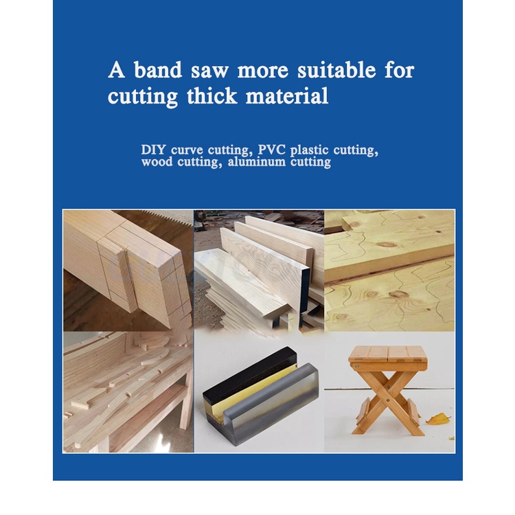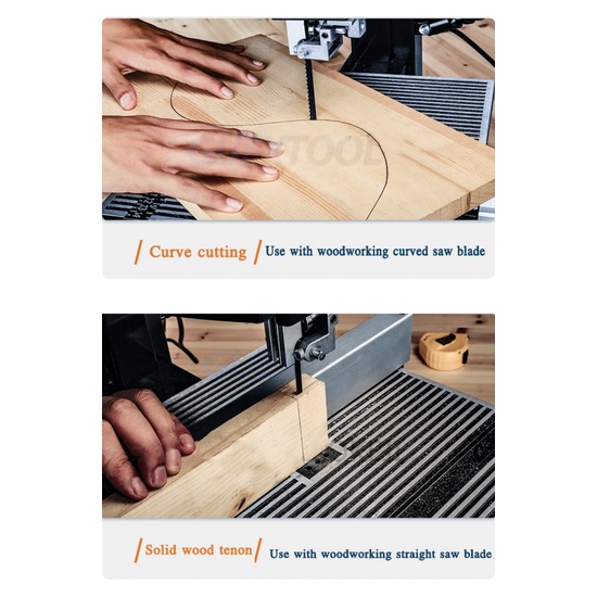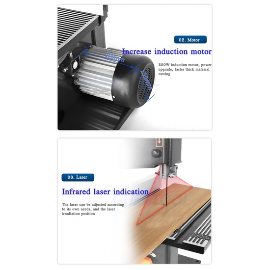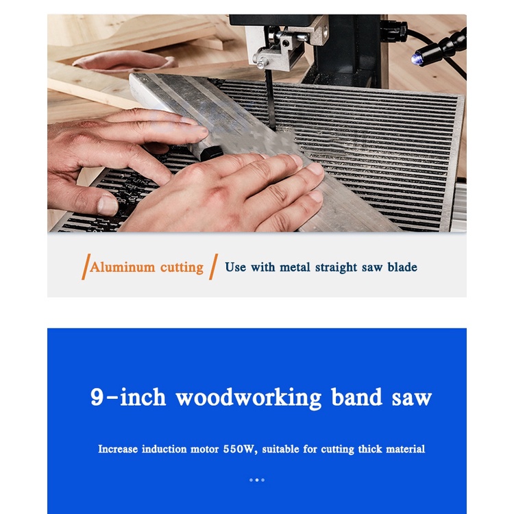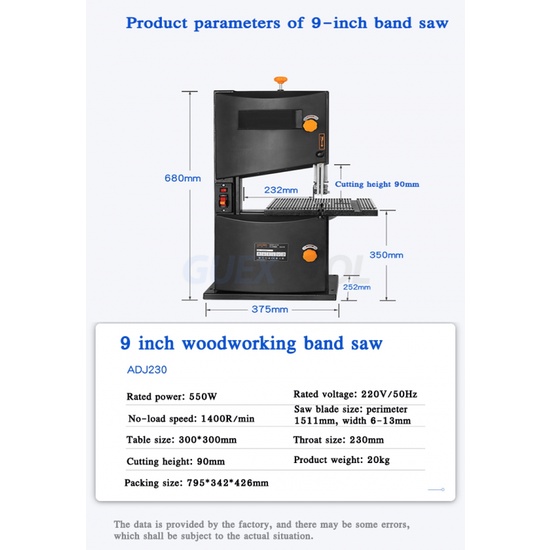 Product parameter 8 inch band saw Voltage: 220V~ 50Hz Power: 350W Cut height: 85mm Saw blade: circumference 1400mm wide 6-13mm No load: 1400R/min Throat depth: 200mm Weight: 18.3Kg Packing: 740x340x390mm No LED lighting/laser tool setting 9 inch band saw Voltage: 220V~ 50Hz Power: 550W Cut height: 89mm Saw blade: circumference 1511mm wide 6-13mm No load: 1400R/min Throat depth: 232mm Weight: 21Kg Packing: 795x342x426mm LED lighting/laser tool setting