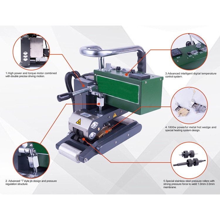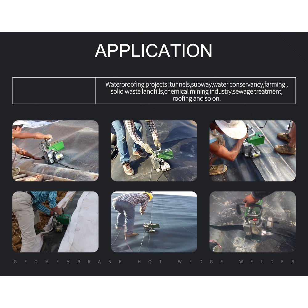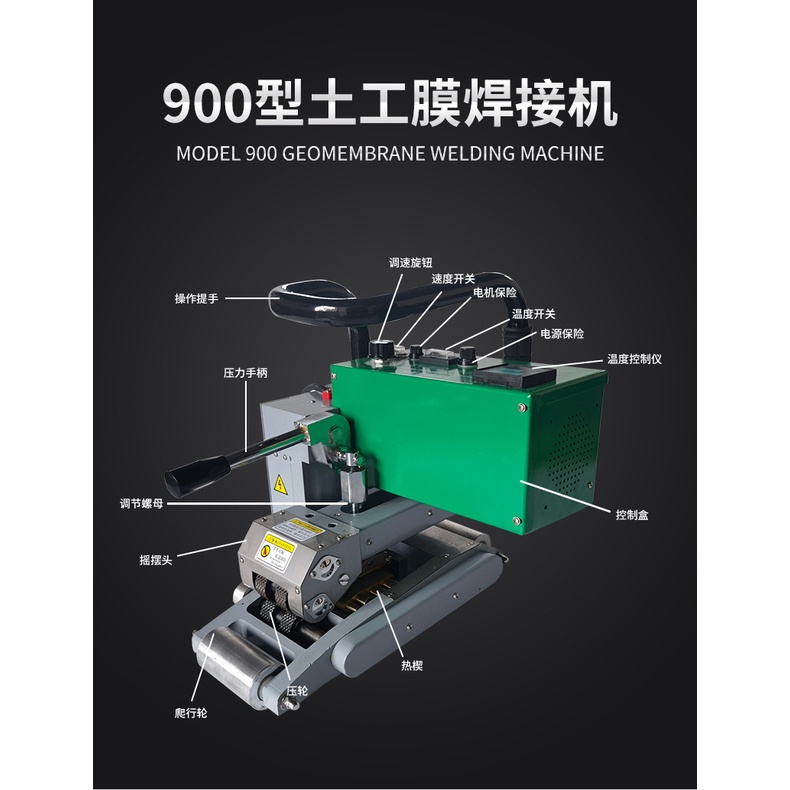 900 series Geomembrane welding machine is our new developed products, which can weld geomembrane of various thickness and are applicable for welding of all thermal-fused material such as LDPE, PVC, HDPE, EVA, PP and so on. The control of this series of welding machine adopts PID automatic thermostatic control with high control accuracy and low temperature fluctuation; speed control adopts PWM automatic voltage and speed regulationcircuit, driven by DC servo motor, with great output torque and the operating is stable. It can maintain a constant speed on the condition of creeping, vertical creeping and variable road load. Also thisseries of welding machine is stable in performance despite of external temperature and voltage variation.