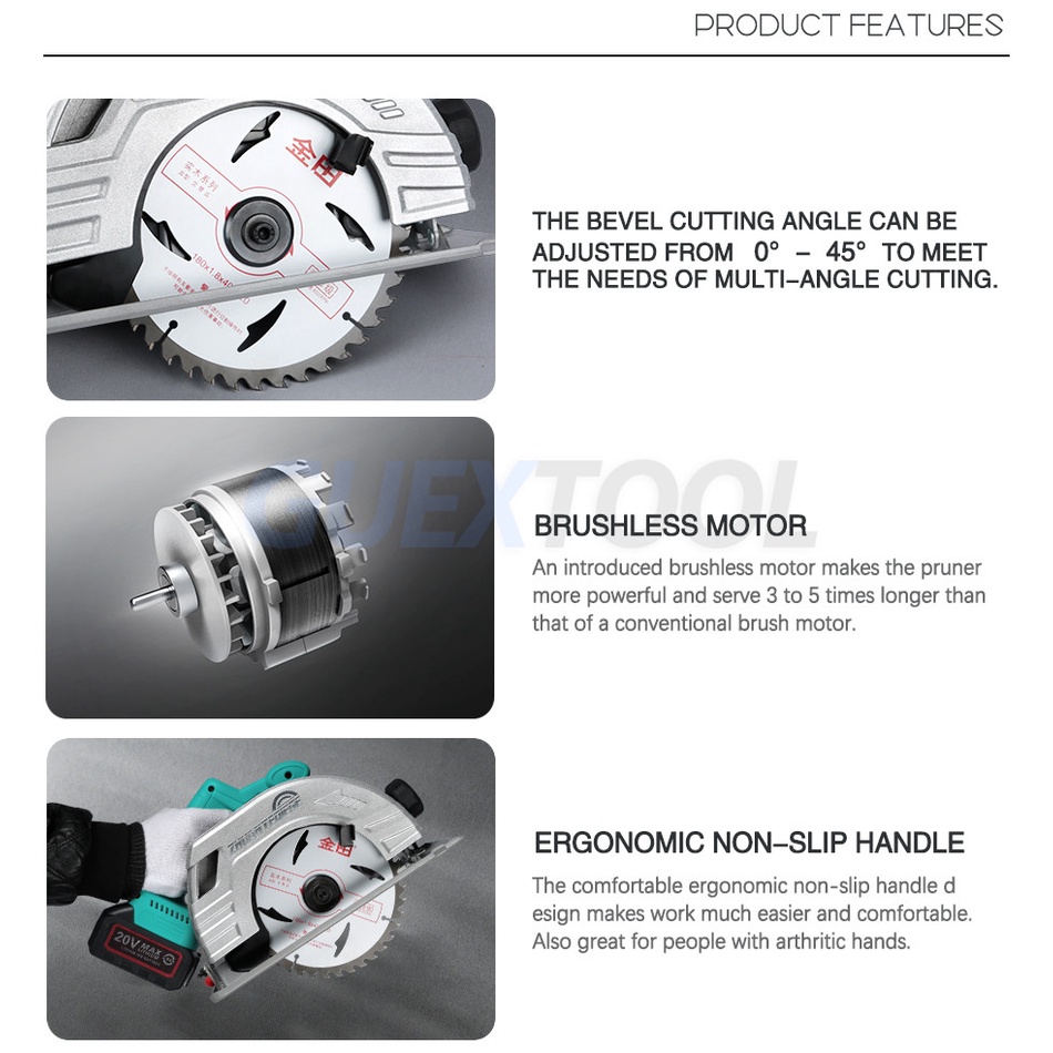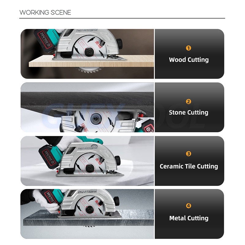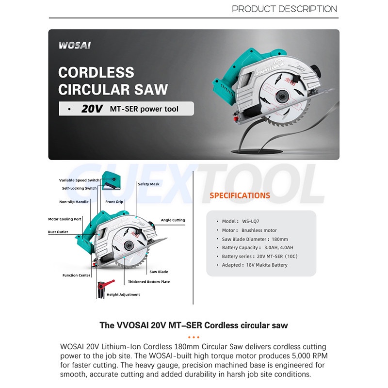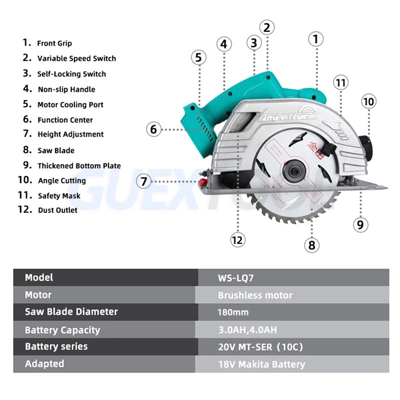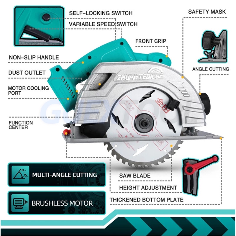 Power Source : Battery Certification : None Origin : CN(Origin) Saw Type : Circular Saw Rated Voltage : 20V Usage : Home DIY No-Load Speed : 5000rpm Application : Wood Saw Max. Cutting Depth : 64mm Bevel : 0-45 degre Battery series : 20V MT-Series (10c) Weight : 3.45kg Blade Diameter : 180mm