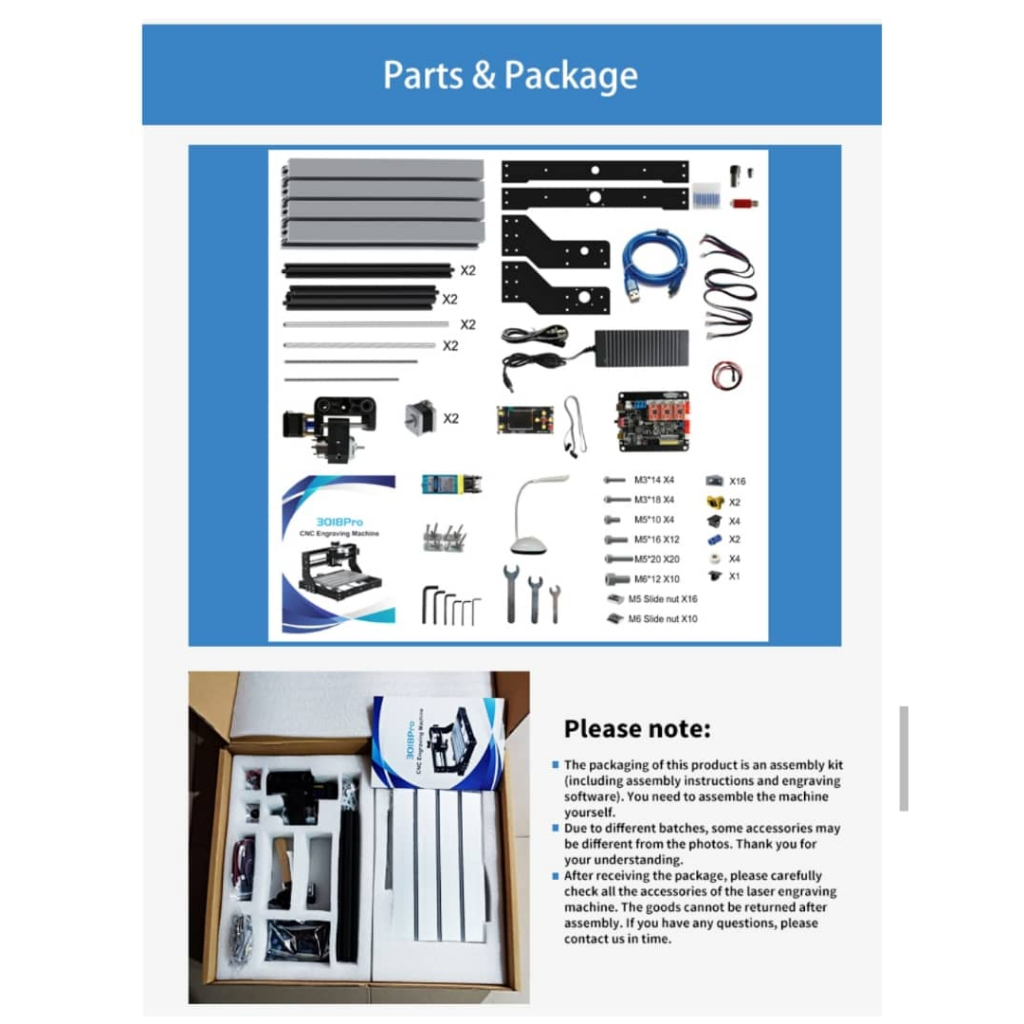 Assembly is a breeze with our included English instructions and assembly videos, and the machine is compatible with various processing instructions such as CNC: G-CODE, TAB, NC, NCC files/laser G-CODE, JPG, DXF files. The CNC3018Pro is also USB compatible and works with Windows XP.win7.win8.win10.