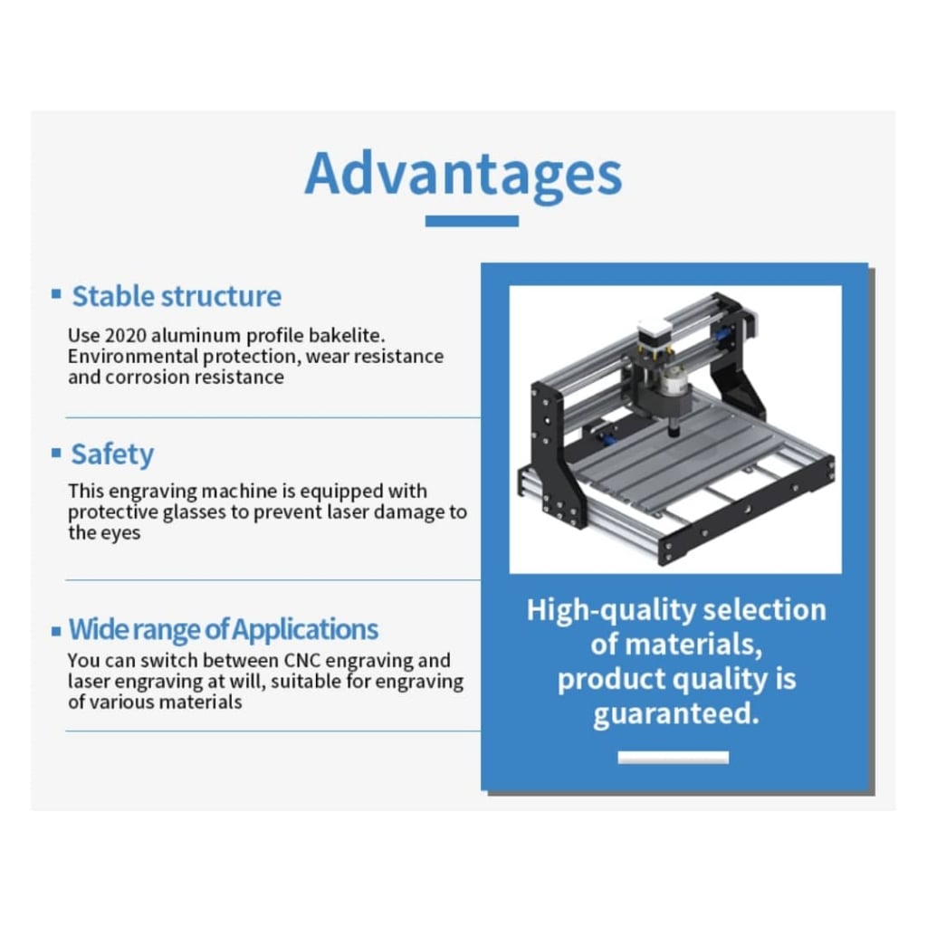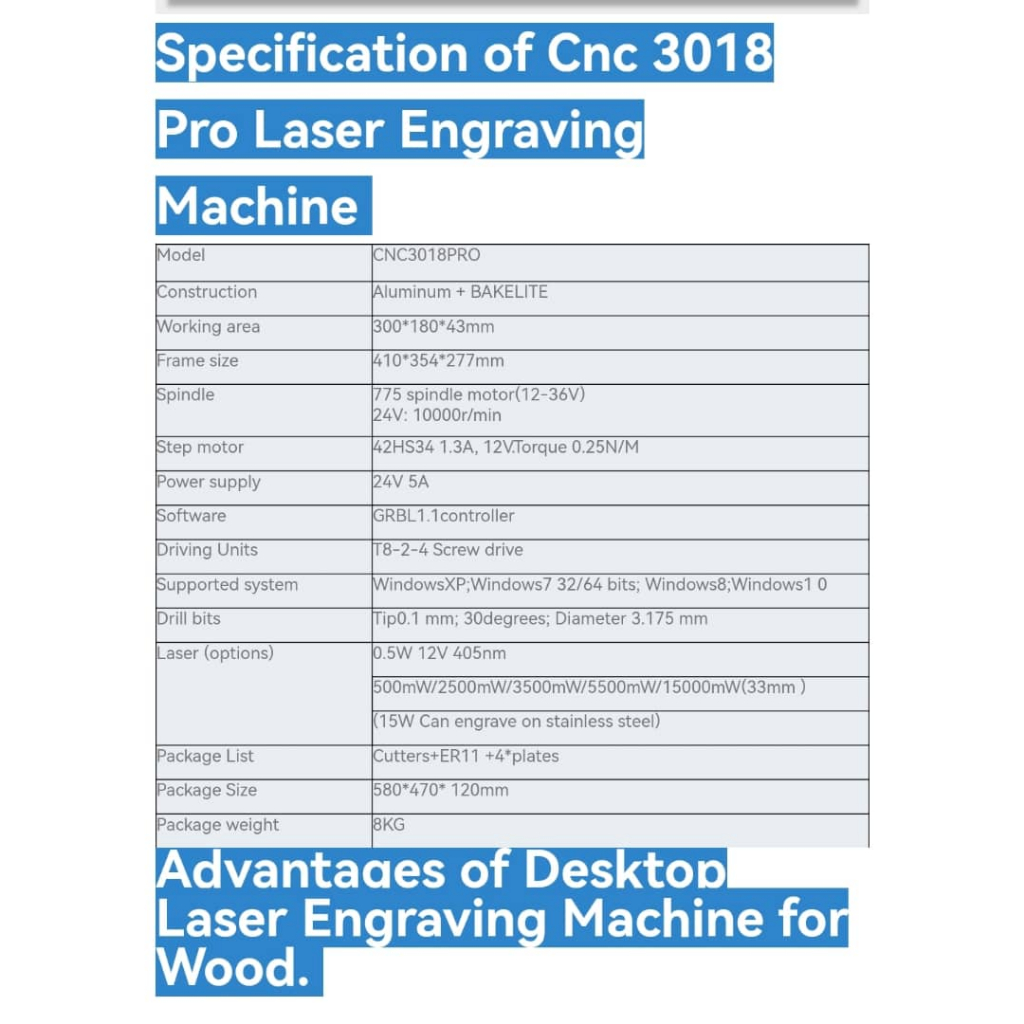 不要错过这个让你的木工和图片雕刻技能更上一层楼的机会。立即订购CNC3018Pro,从家中开始创作杰作!请注意,我们还提供多种功率的激光头可供选择,如果需要,请联系我们的客户服务团队。