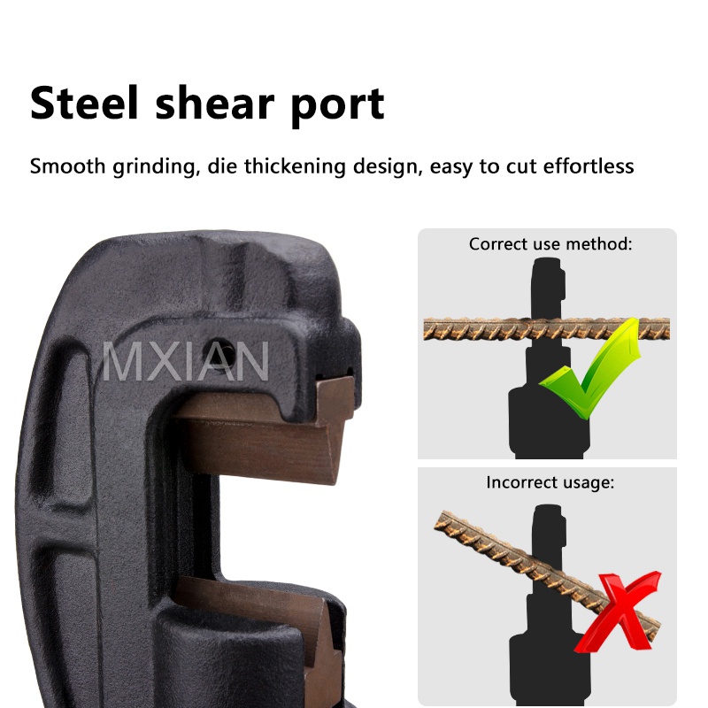 Tip: This steel bar shear is only used to cut steel bars. If the shearing of other things (such as U-shaped locks, iron chains, etc.) causes damage, the store is not responsible for it, please bear it by yourself! ! !