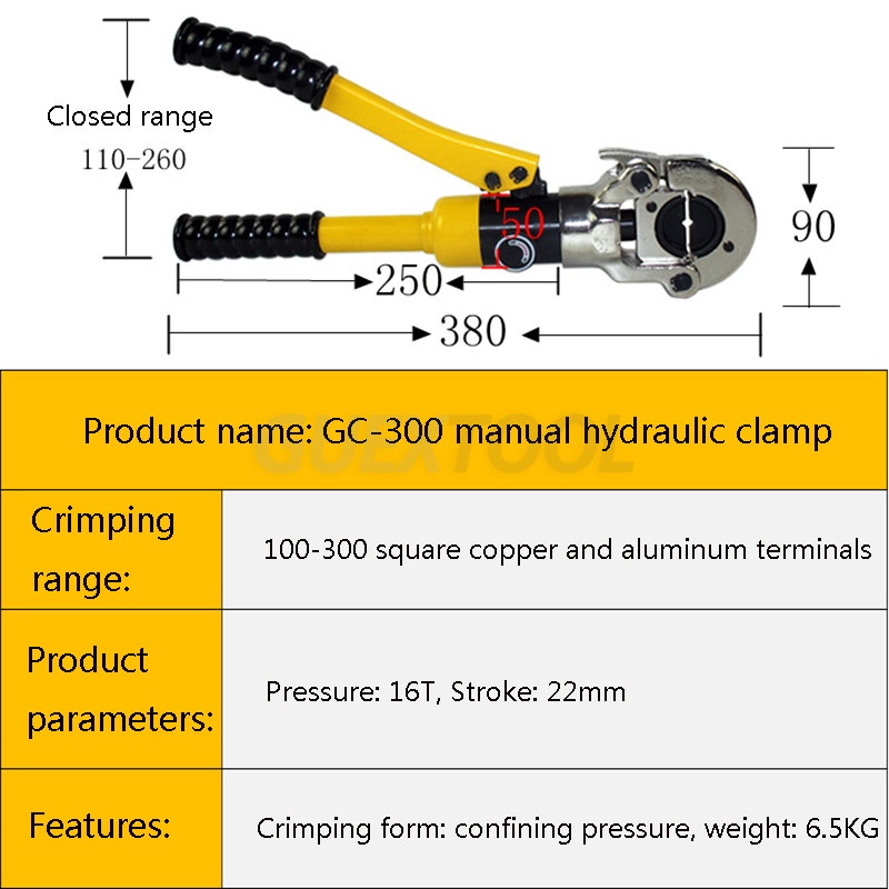 Product specification Product name:GC-300 manual hydraulic clamp Press range :10-300 square copper-aluminum terminals Pressure :16 T Stroke :22 mm Pressing Form: Perimeter Pressure Weight :7 KG