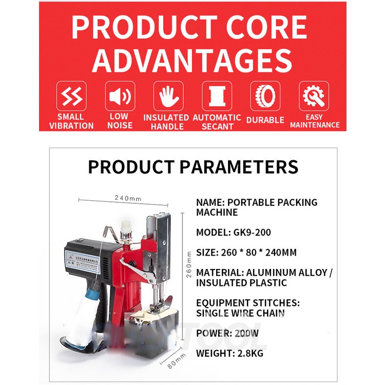 Name: Portable Packing Machine Size: 260*80*240mm Material: aluminum alloy/insulated plastic Equipment stitches: single wire chain Power: 200W Weight: 2.8kg
