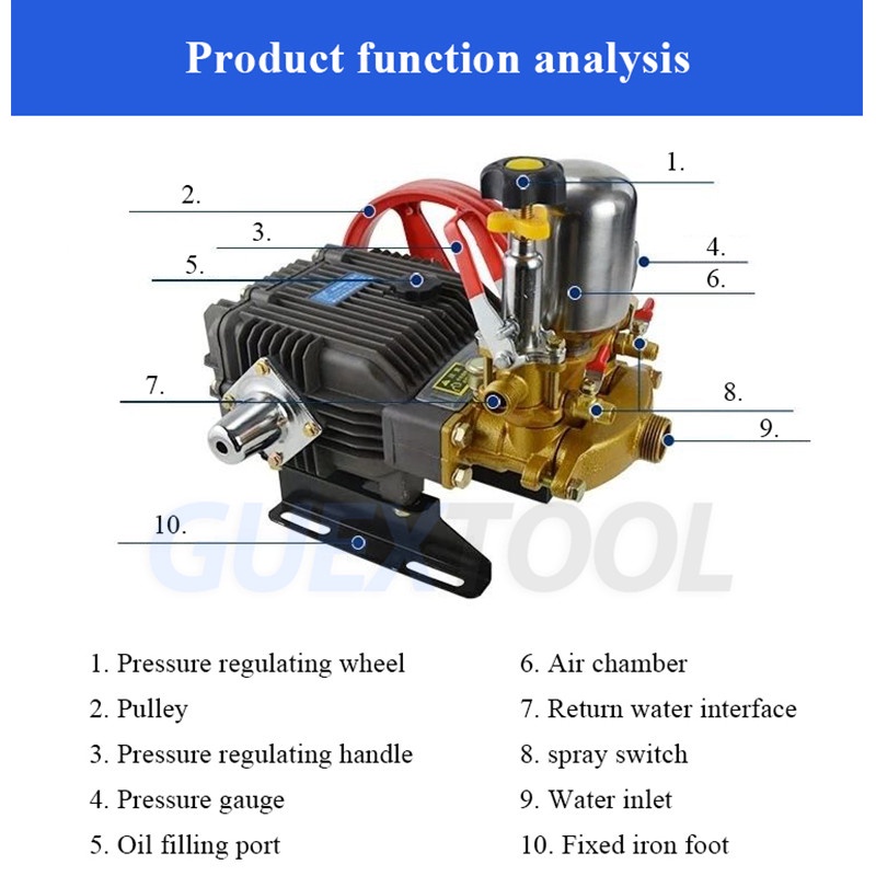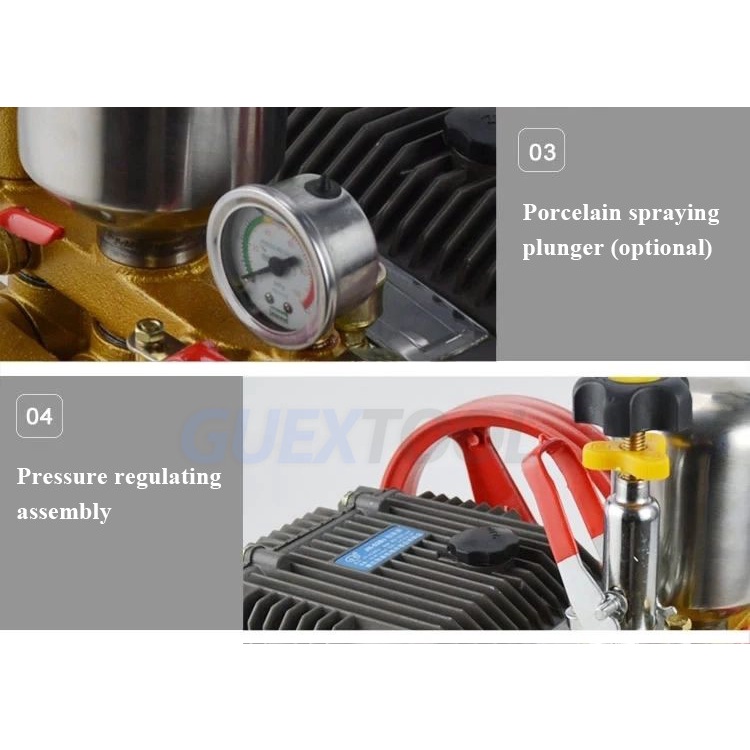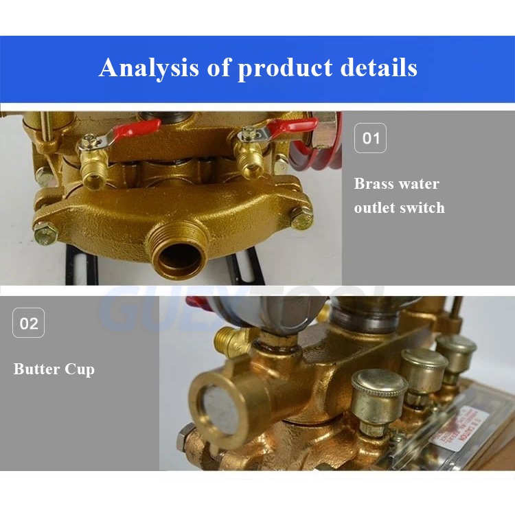 Brand Name: GUYX Model: 26 triplex plunger pumps Flow: 12-22L/min Matching motor: 1.5-2.5kw Plunger diameter: 22mm Working pressure: 1.0-3.0Mpa Engine speed: 800-1400r.p.m. Gasoline horsepower: 7.5HP