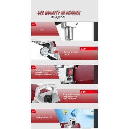 Product Name: Smart Sprayer Model: 9450 Product power: 1500W Maximum flow: 2.3L/min Best spray distance: 35cm Jet width: 30cm Maximum working pressure: 22Mpa The longest connecting hose: 60 meters Maximum pressure: 2800/PSI Machine weight: 14kg