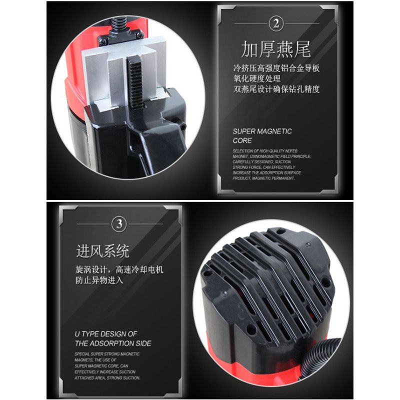 Voltage : 220V 50~60hz Speed : 0~600r/min Power : 1050W Tapping abilit : YES Forward and reverse function : YES Speed adjustable : YES Machine working size : 110mm Electromagnet suction : 9000N drill diameter : 16mm Net weight : 10.5kg Overall size : 350x150x360mm suction : 165x78x50mm Product parameterVoltage:220V 50~60hzSpeed:0~600r/minPower:1050WTapping ability:YESForward and reverse function:YESSpeed adjustable:YESMachine working size:110mmElectromagnet suction:9000Ndrill diameter:16mmNet weight:10.5kgOverall size:350x150x360mmsuction:165x78x50mm