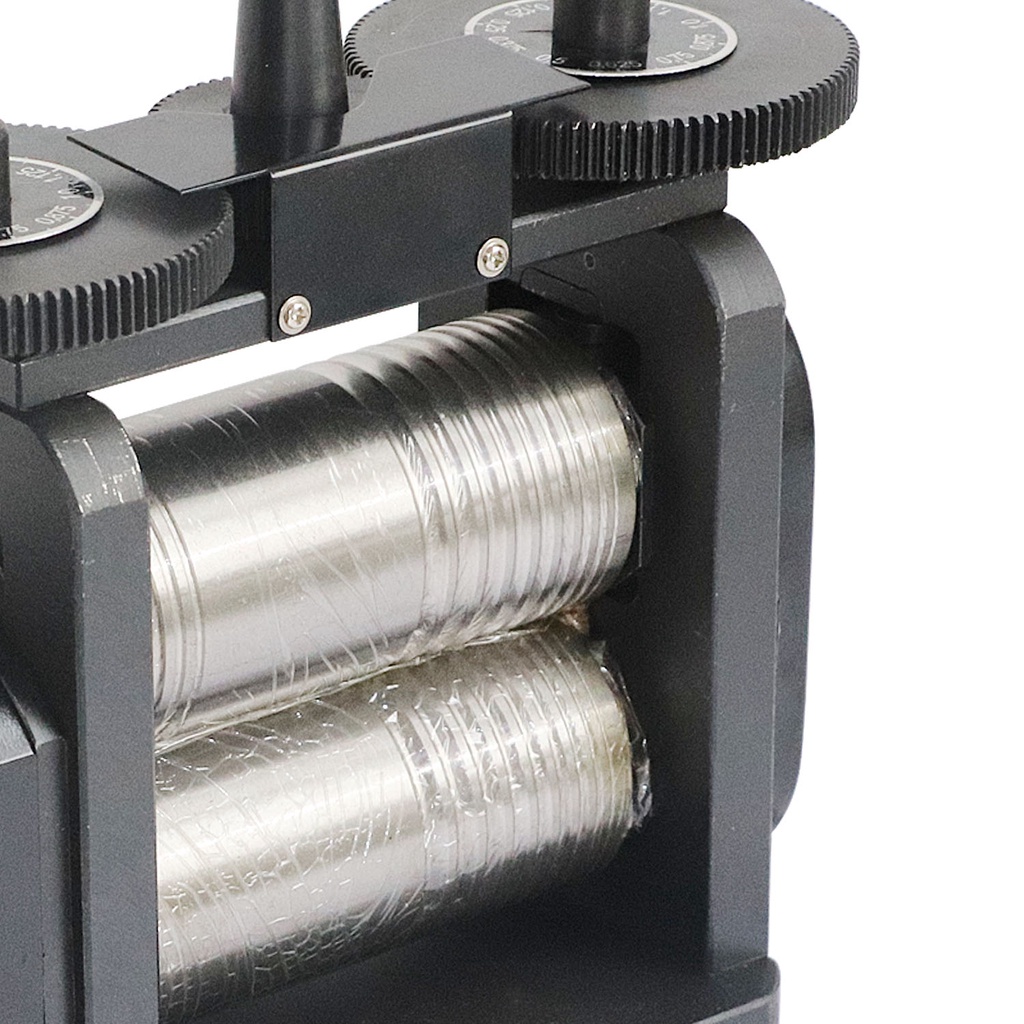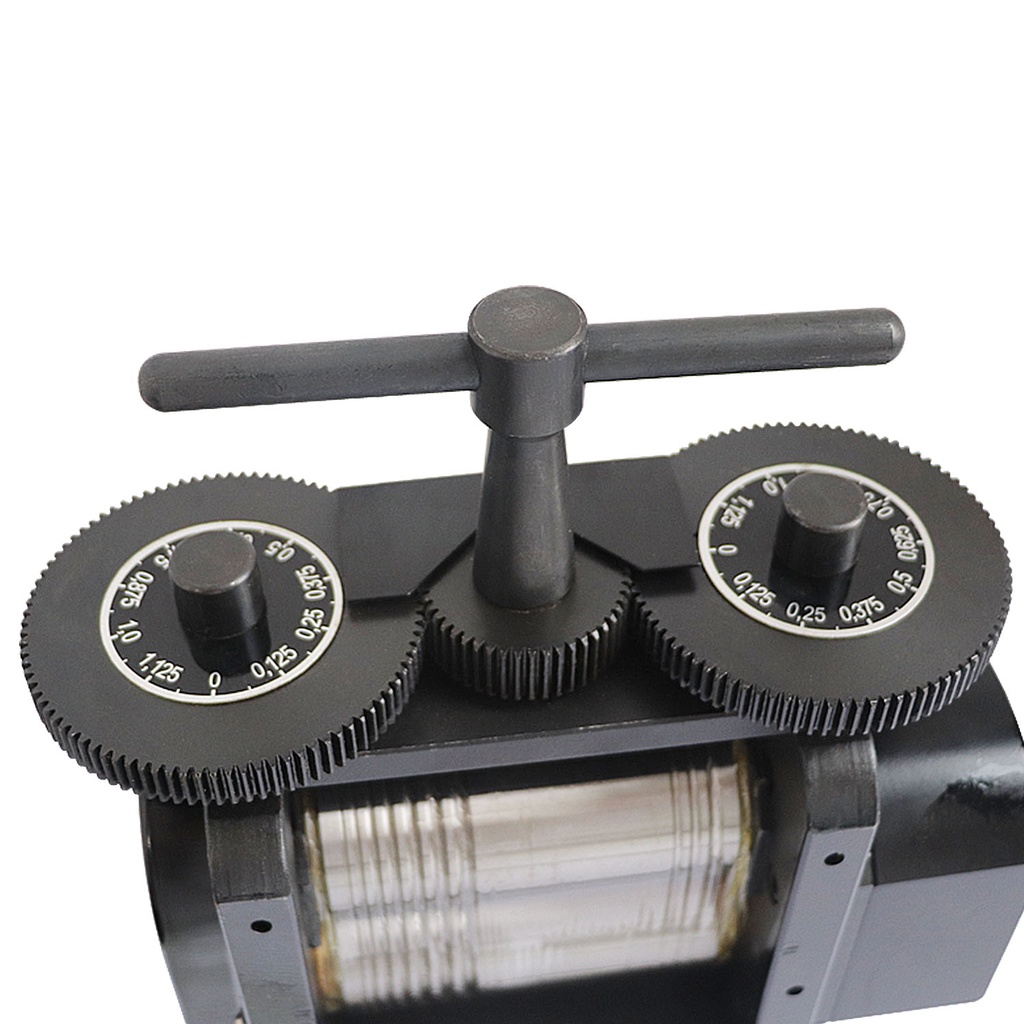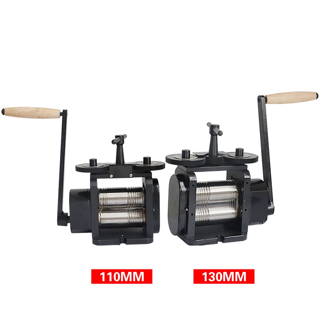 Description Jewelry Rolling Mill Machine Roller width: 110 mm/ 130 mm Roller diameter: 55 mm/65 mm Maximum opening: 4 mm/ 5 mm Flat area (+/- 0.01mm): 53 mm / 57 mm Square wire(+/- 0.01mm): 1.0, 2.0, 2.5, 3.0,4.0,4.5,5.0./1.0, 2.0, 2.5, 3.0,4.0,4.5,5.0,5.5,6.0,6.5,7.0 Ring shank - half round ellipse(mm): 2.5x1, 3x1.25, 4x1.5/2.5x1, 3x1.25, 4x1.5 Produce metal foil as thin as .001 inch. Machine size:230*135*280mm/250*145*290mm Package size:330*330*200mm/340*340*200mm Efficient Design: Reduction gear ratio of 4:1 allows the rollers to make one complete turn for every four turns of the rolling mill handle. This relieves the amount of force needed to operate the rolling mill. Easy to Use: With forged handle, simple and convenient to use. Easily mounts the rolling mill to your workbench using the mounting holes. Build to Last: The rolling mill has a reasonable structure, long life span, perfect workmanship and the simplicity of operation.Rolls made from stainless alloy that offers good wear resistance . Application: The combination rolling mills are ideal for jewelers and crafts-people. Rolling Mills are designed for cold rolling metal to produce thinner gauges of sheet metal and wire, transferring textures to your metal and to make the thickness uniform.