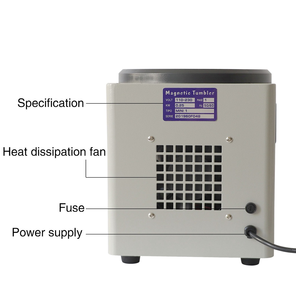 Details KT-185s Magnetic Polishing Machine Magnetic tumbler voltage: 110v/ 220v Power: 250W; Burnishing pins: 200g #5; Time control: 2-30 minutes; Two directions Magnetic polisher speed: 2000rpm; Capacity: 1.32 lbs/ 600g; Roller size: 7"×4"(180 x 100mm); Time control: 10-60 minutes Jewelry polisher finisher supplied complete with an acrylic bowl; Designed for polishing intricate details, tiny crevices, and multiple settings, but not flat surfaces Magnetic tumbling is an automated polishing process that nearly eliminates the need for cyanide bombing, stripping, and thrumming KT185 magnetic tumbler is suitable for light metal, non-ferrous metals, hard plastic and other precision parts, for irregular-shaped parts, hole, tubular and other dead ends, cracks, etc. Its can be polished, adjust the variable frequency, to meet a variety of polishing needs
