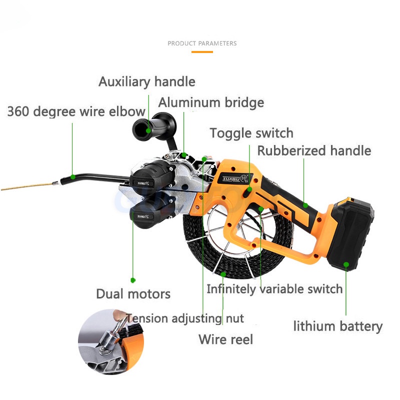 Product parameters Product name: Electric threader Voltage: 220V Line speed: 40M/MIN Pulling force: 180kg+ Battery: 86VF 10000MAH Current: 1.5A Lead wire: single wire lead wire, spring lead wire, etc. Application: Construction hydropower, home improvement hydropower, network communication, etc. Product name: Electric threader Voltage: 220V Line speed: 40M/MIN Pulling force: 180kg+ Battery: 86VF 10000MAH Current: 1.5A Lead wire: single wire lead wire, spring lead wire, etc. Application: Construction hydropower, home improvement hydropower, network communication, etc.
