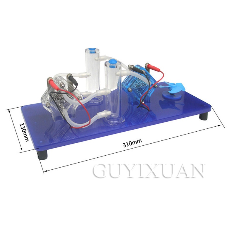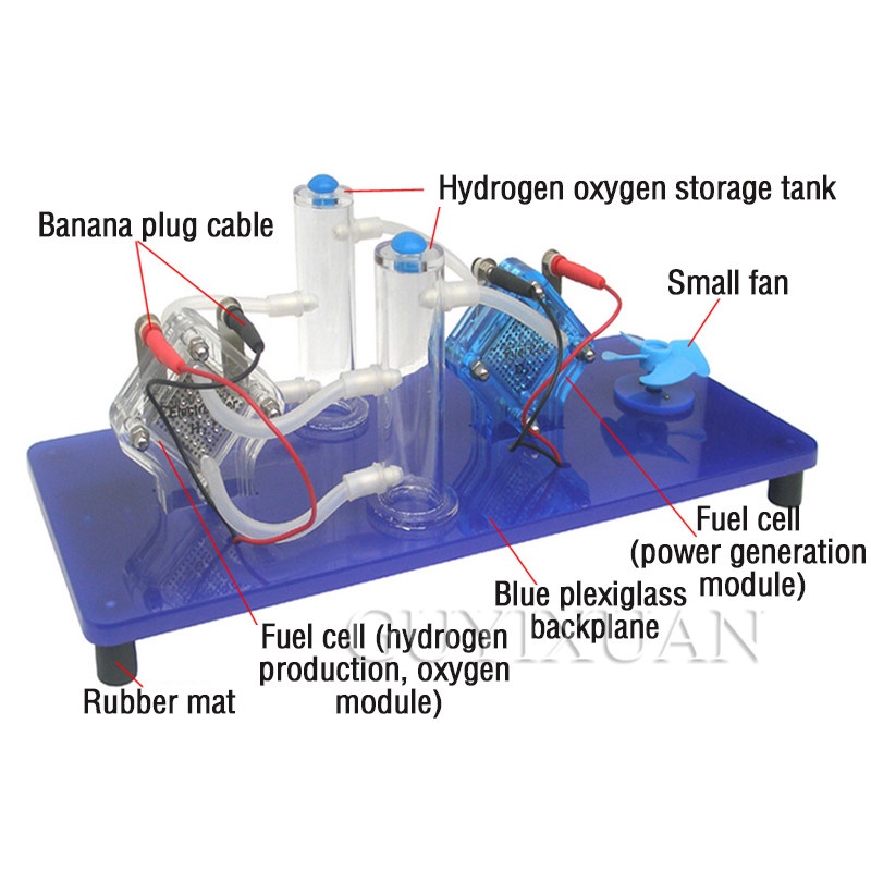 Product parameters Brand: GUYX Size: 20*20*25 Weight: 2.0kg Please contact customer service for detailed parameters. Instrument operation instructions: Install a 1.5V*2 battery in the battery compartment at the bottom of the bottom plate, open the soft rubber plug on the upper part of the gas storage tank, and fill the tank with water. (Note: The water injection should be connected to the lower part of the gas pipe of the fuel cell power generation module on the right side to avoid water. Enter the power generation module to cause damage), cover the rubber plug, and the fuel cell electrolysis module is infiltrated with water for a little time. The wiring connecting the battery box is connected to the fuel cell electrolysis module in red and black, and the small fan connection cable is connected to the power generation module of the fuel cell. During the experiment, bubbles began to appear in the reaction window of the front and back of the electrolysis module, that is, the water was electrolyzed into hydrogen and oxygen, and entered the gas storage tank along the gas pipe in the upper part of the module. Since the whole product is in a closed state, the hydrogen and oxygen gas pipes enter the power generation module, exchange in the proton membrane in the power generation module, generate current and water, and the small fan turns.