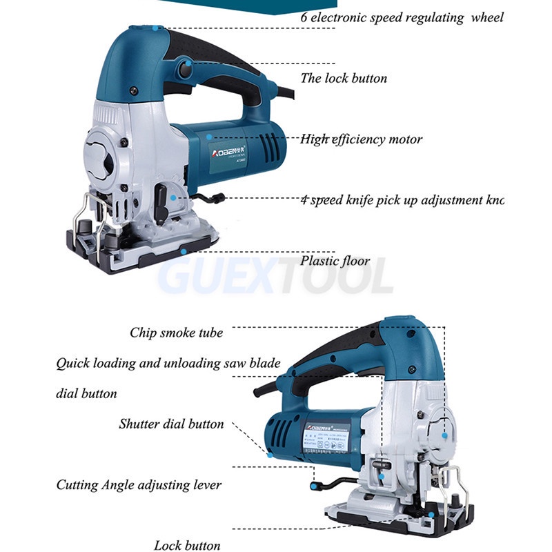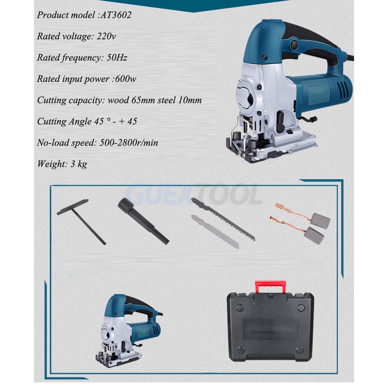 Product model: AT3602 Application: Wood Saw Rated input power: 600w Power: 500W-799W Rated voltage: 220V Frequency: 50Hz Weight: 3KG Size: 27*22*10cm