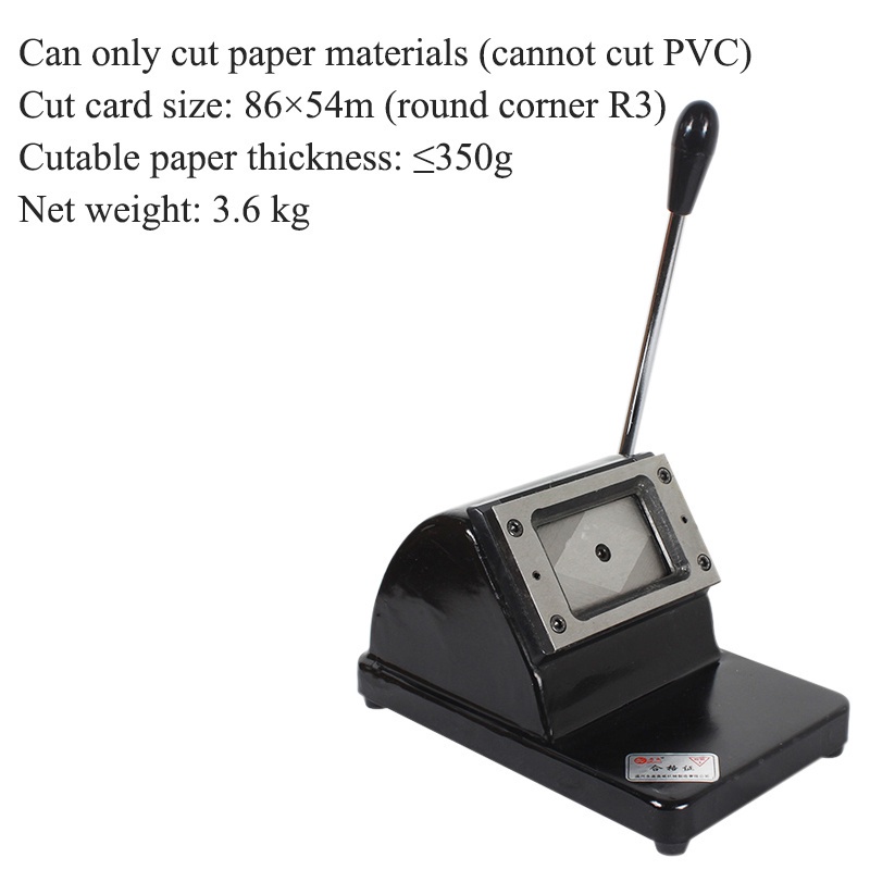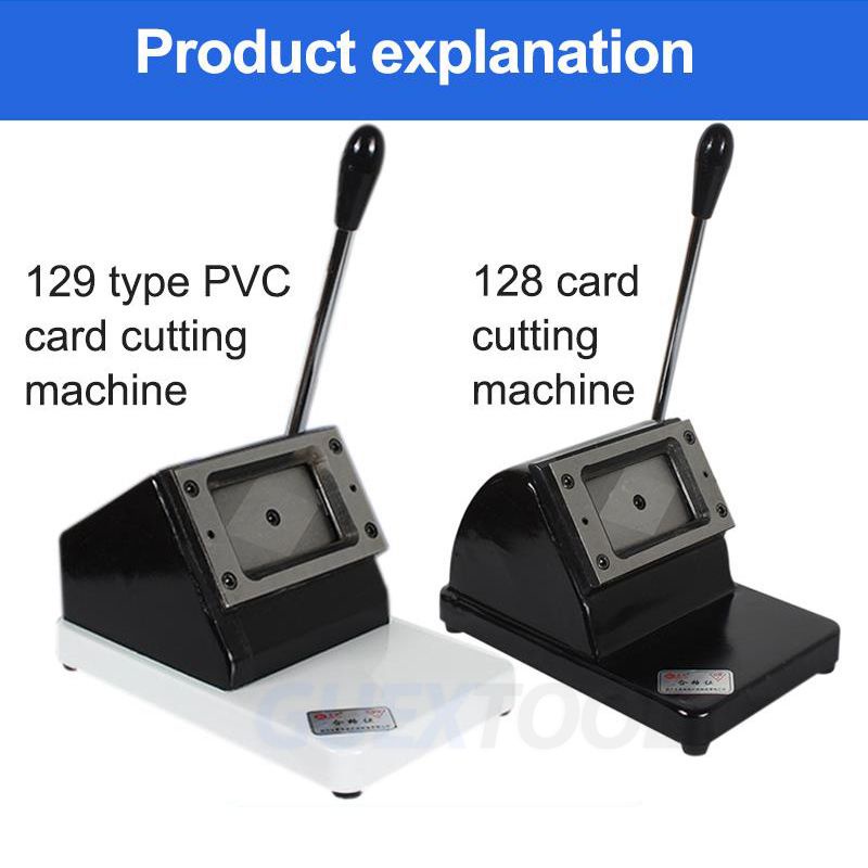 Name: 129PVC Card Cutting Machine Cutting size: 86*54mm (rounded corners) Product size: 280mm*170mm*355mm Gross weight: 4.6kg Chassis material: all steel Name: 128 business card cutting machine Cut size: 86*54mm rounded corners 90*55mm square corner Product size: 225mm*160mm*355mm Gross weight: 4kg