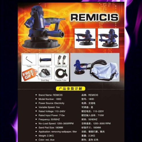 Brand Name : REMICIS Model Number : 180D Variable Speed : Yes Ratee Voltage : 110- 240V Rated Input Power : 710w Frequency : 50/ 60HZ No-Load Speed : 1200- 3000 RPM Sand Pad Size : 180mm Weight : 2.3KG Colour : Red