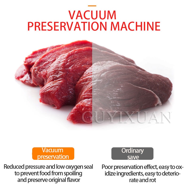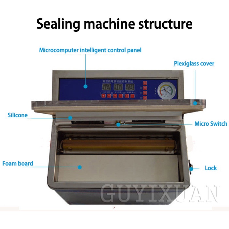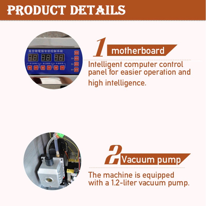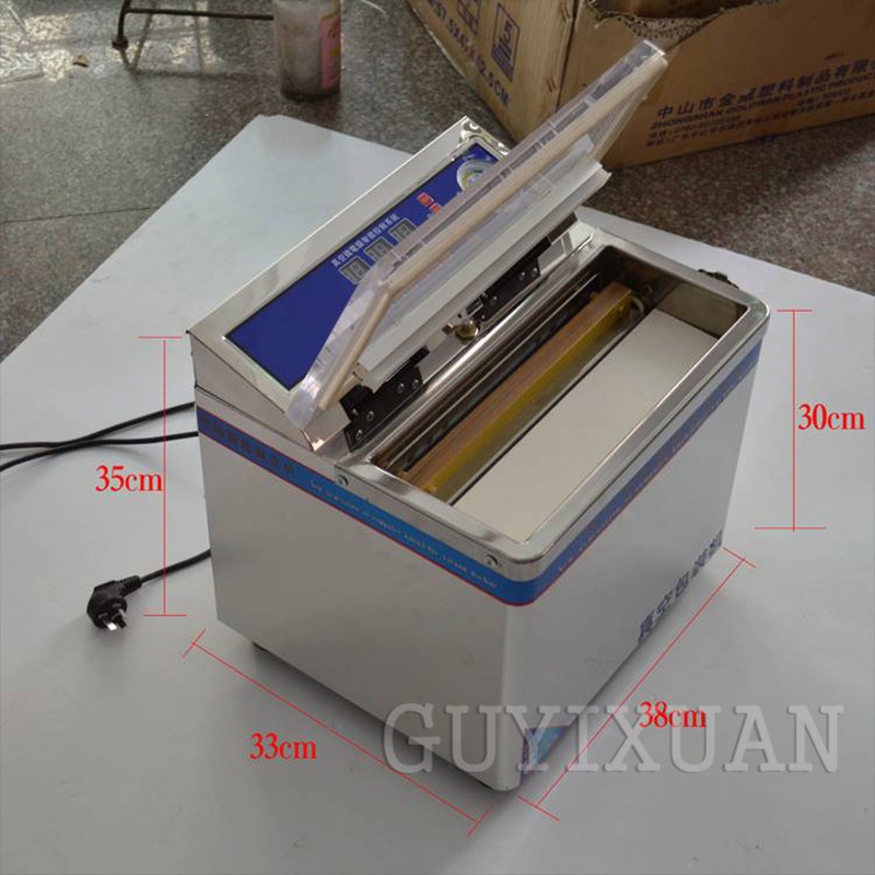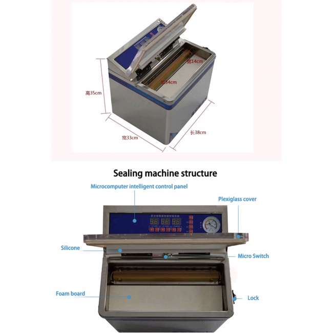 Product Name:Food vacuum preservation sealing machine Rated voltage: 200v-240v Power consumption: 280w Machine weight: 25kg Product material: high quality stainless steel mirror Product size (length, width, height cm): 38*33*30 Vacuum chamber (length, width, height cm): 34*9*27 Sealing length: 32cm (single seal) Number of vacuum pumps: 1.2L/1