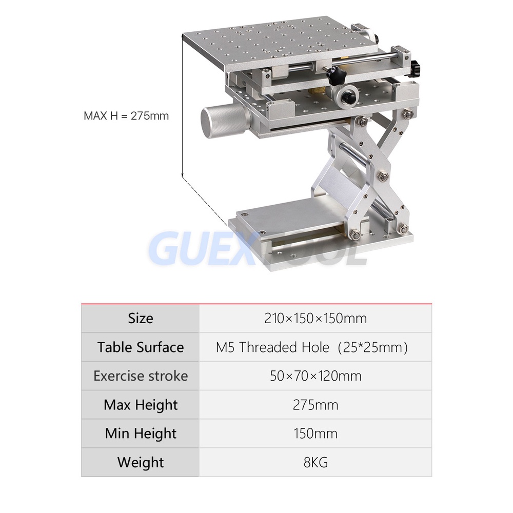 Brand Name: GUYX Product parameters: Minimum height: 150mm Maximum height: 275mm Table: M5 threaded hole (25*25mm) Application: Fiber Laser Marking Machine