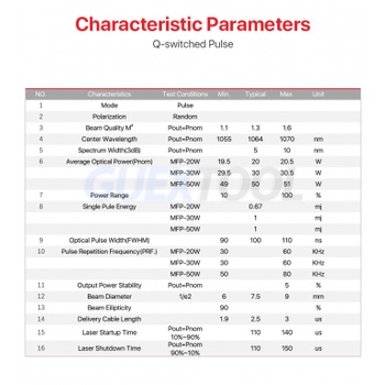 Brand Name: GUYX Center wavelength: 1064nm Output power: 5% Mode: Pulse Laser start time: 110-140um W : Standard Edition X : smaller than the standard version Model: MFP-20/30/50 Polarization: Random Power range: 10-100% Beam ellipticity: 90% Laser off: 110-150um L : Simple version