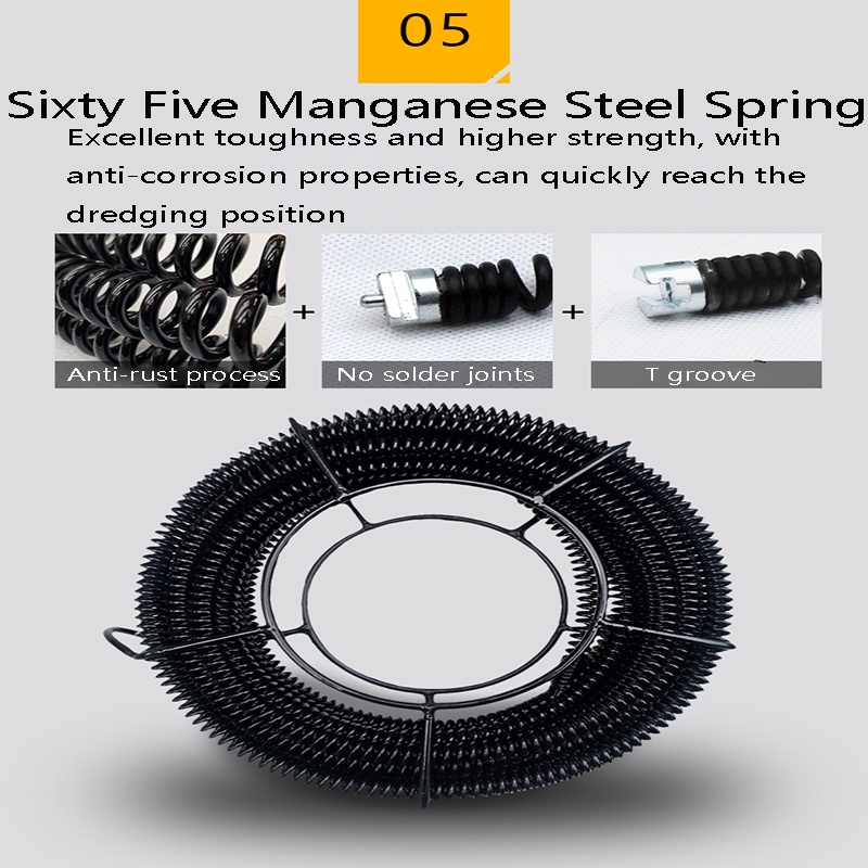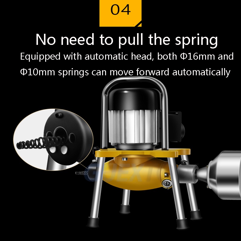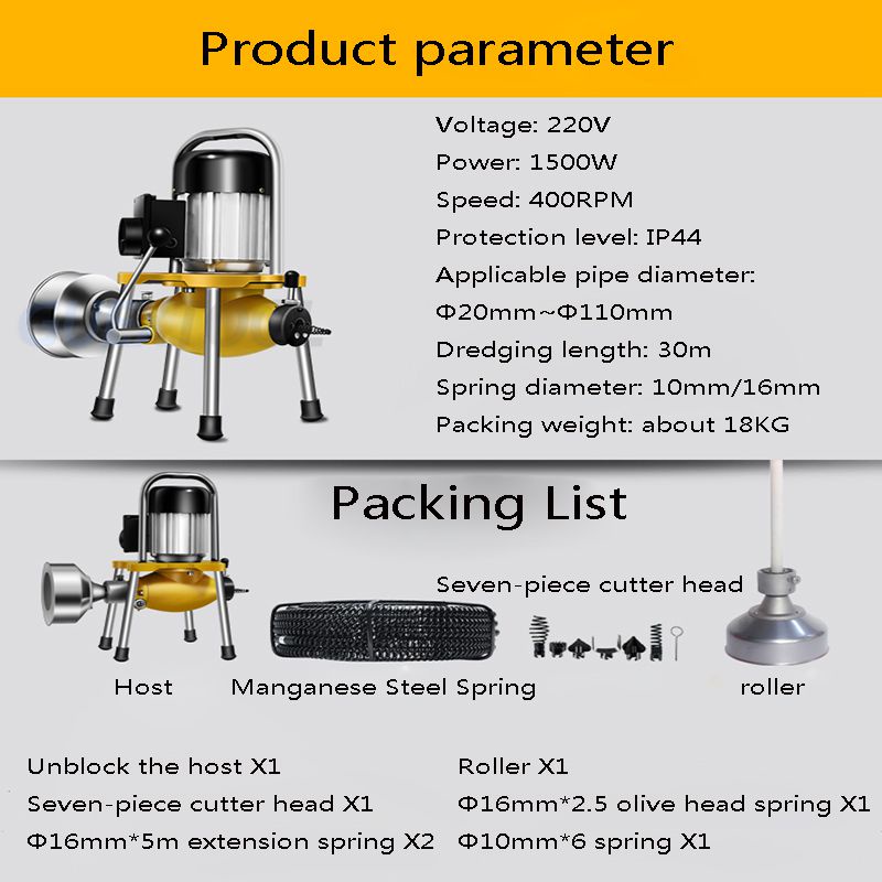 Product specification Voltage: 220V Power: 1500W Speed: 400RPM Protection level: IP44 Applicable pipe diameter: Φ20mm-Φ110mm Dredging length: 30m Spring diameter: 10mm/16mm Packing weight: about 18KG