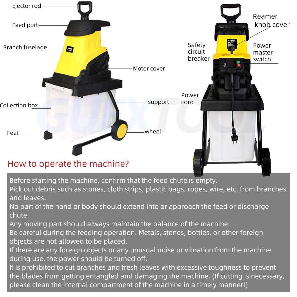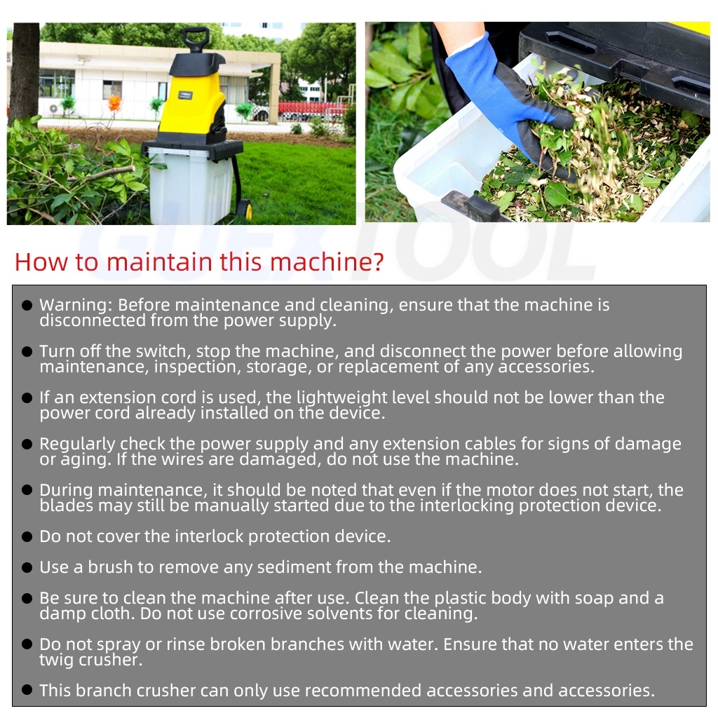 It is prohibited to cut branches and fresh leaves with excessive toughness to prevent the blades from getting entangled and damaging the machine (if cutting is necessary, please clean the internal compartment of the machine in a timely manner!)