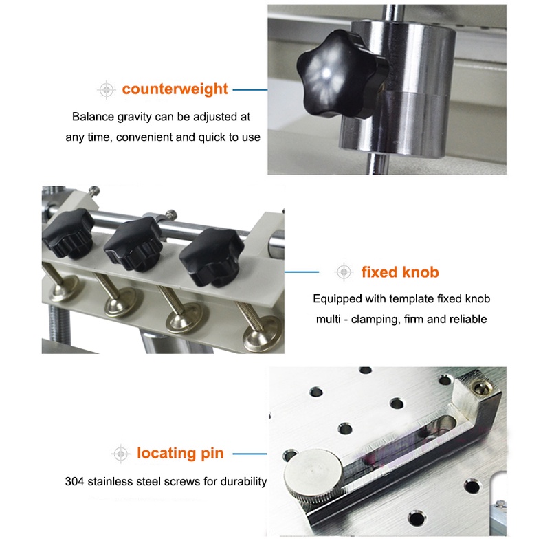 3.Stencil stent uses spiral bearing and height can be adjusted up and down, which is convenient tocontrol PCB's thickness and volume of printing cream.
