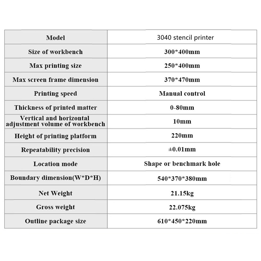 3040 high precision stencil printer is mainly designed for the requirement of the single or double-side PCB soldering paste and red glue printing, the working platfore is processed by cellular positional hole with high-quality aluminum and the pedestal is soldered by thick steel plate, steadiness and durability.