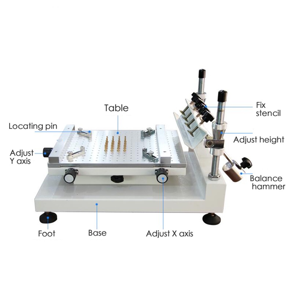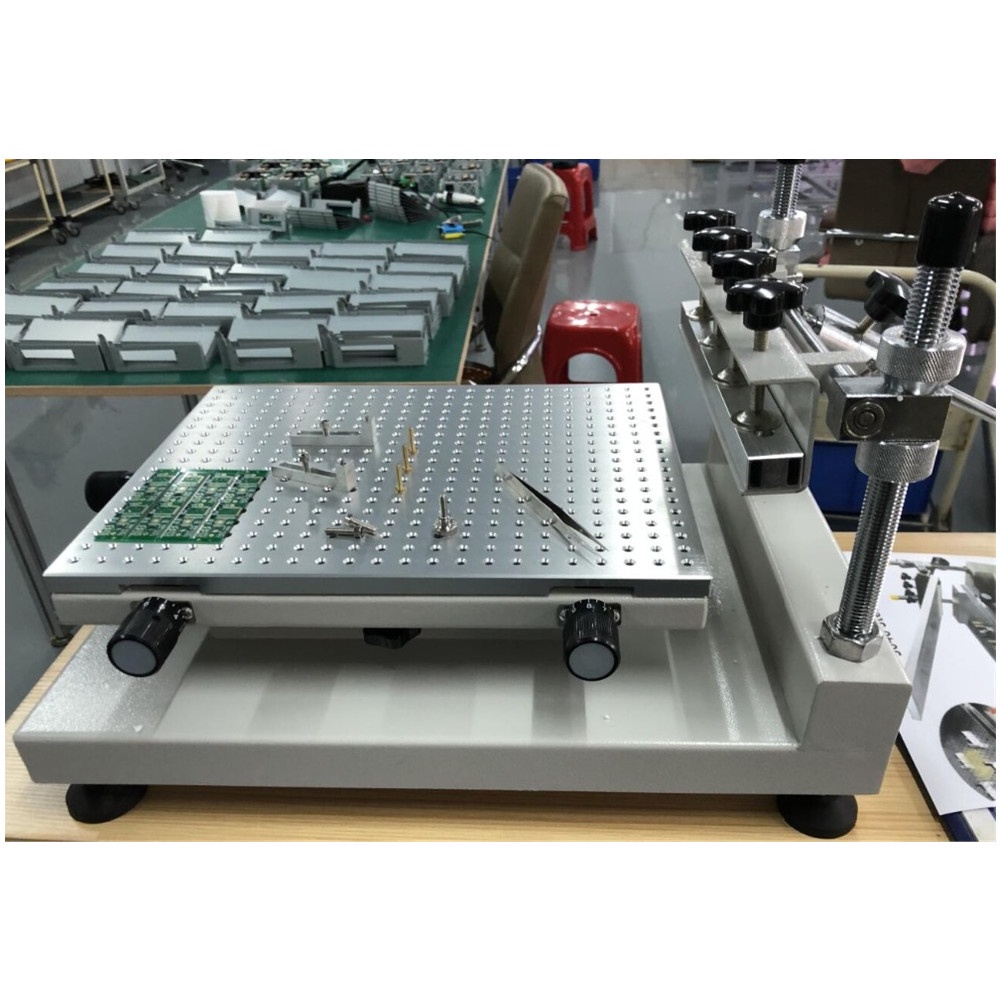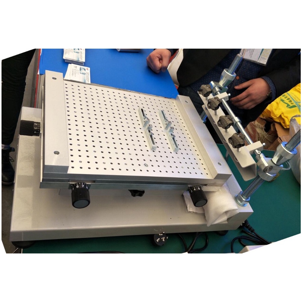 3040 manual printing machine with high precisionis mainly designed for requirements of singleor double-sided circuit board solder cream or red glue printing.The working platform is processedby cellular positioning hole with high-quality aluminum and its pedestal is welded by thick steel platewith steadiness and durability.lts characteristics are as follows: