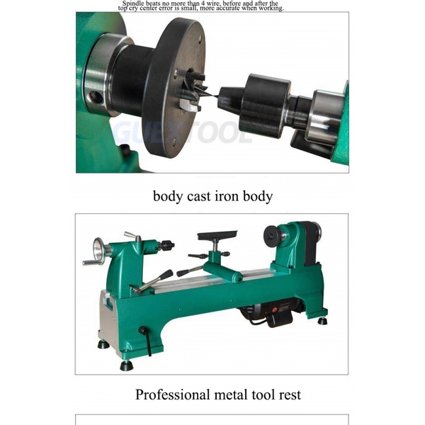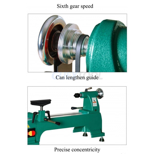 Dengan motor induksi 220V/50HZ yang kuat, mesin kayu ini mempunyai enam gear kelajuan yang berbeza dengan kelajuan puncak 3520 rpm, dan mempunyai diameter pemotongan 10" (254mm) serta jarak pusat 38" (980mm). Dilengkapi dengan lubang poros MT2, anda boleh memasang alat tambahan yang sesuai dengan keperluan anda. Selain itu, berat mesin ini 62KG, yang menjamin kestabilan dan ketepatan kerja anda.
