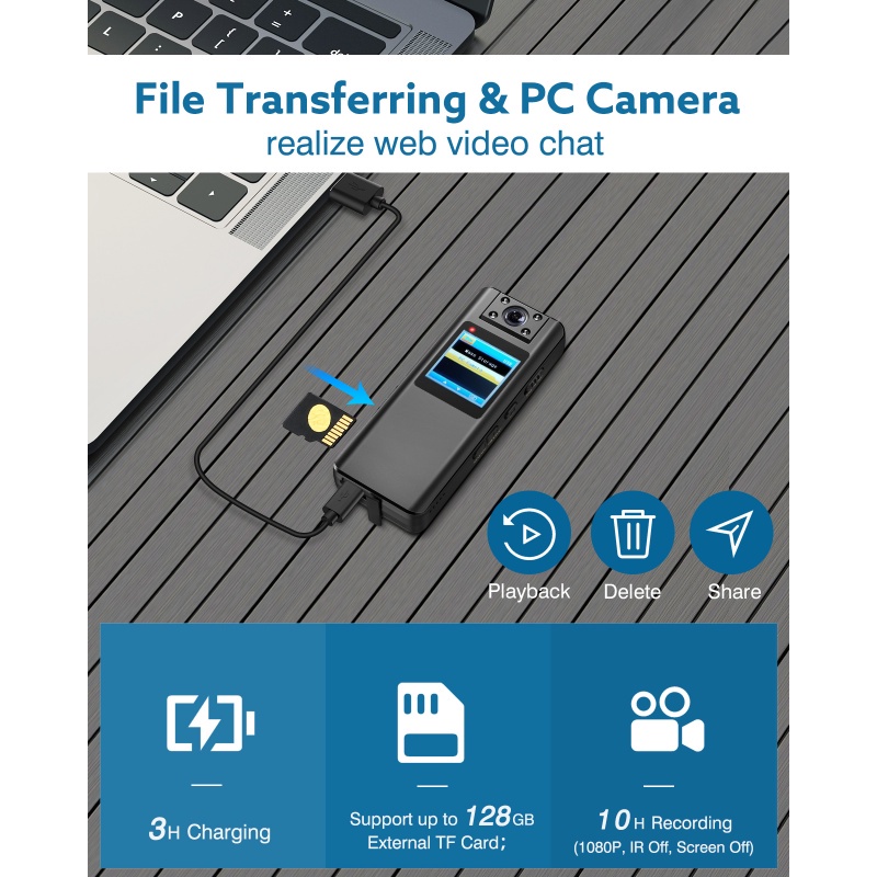 【Built-in 2200MAH Battery】 The portable body camera for daily recording could record 10 hours of the video after fully charged (in 1080P, IR Off, Screen Off). Comes with a high quality 64GB card.