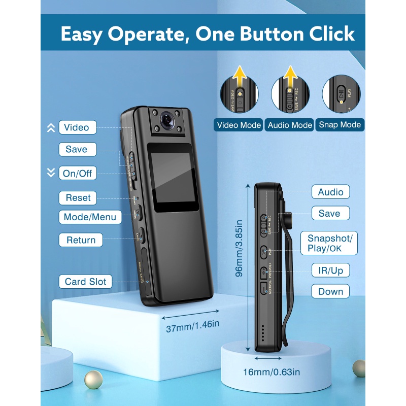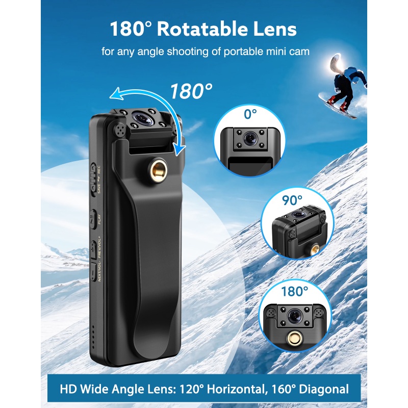 【180 Degrees Rotatable Lens Equipped】 The mini body camera supports to rotate among180 degrees, shoot the valuable moments of your daily life and fantastic travel. Due to this feature, the portable video recorder has different wearing ways. Either clamp to the backpack or put inside into the pocket, a special part of your Outfit of the Day.