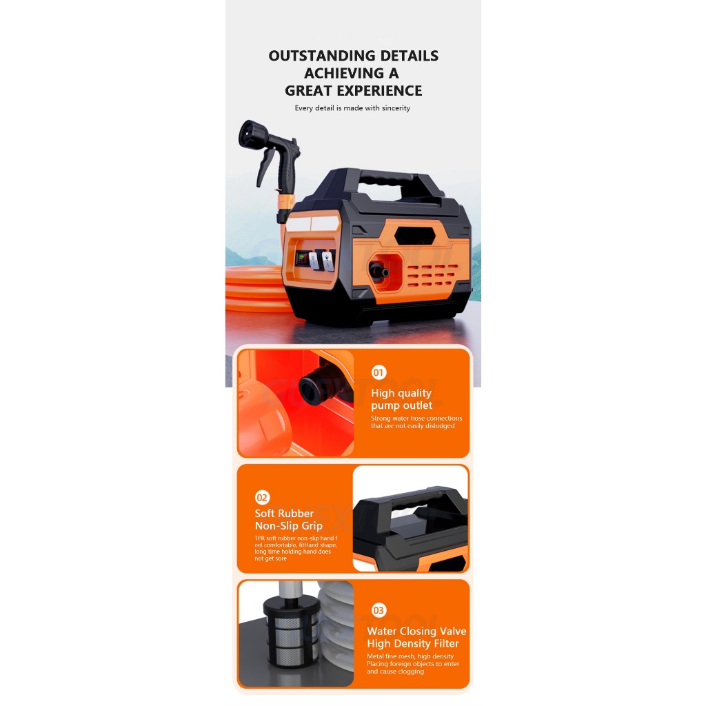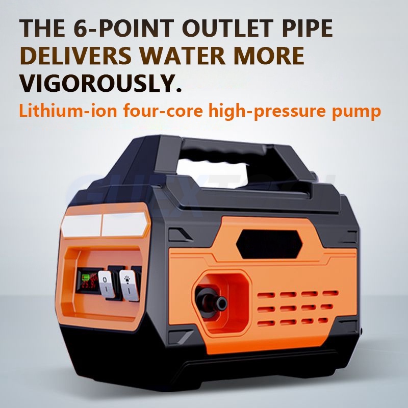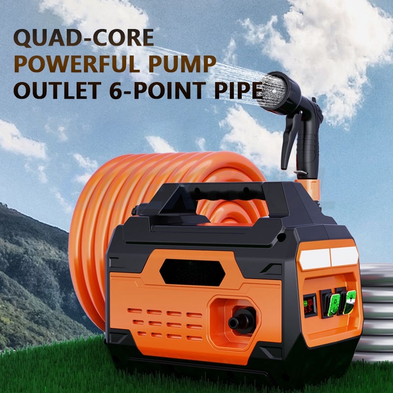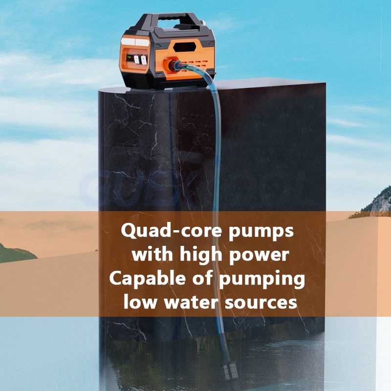 Product name: Portable four-core pump Standard voltage: 24VDC Water distance: not less than 100 meters Suction: > 3 meters Power display: Yes Product size :320*184*270mm