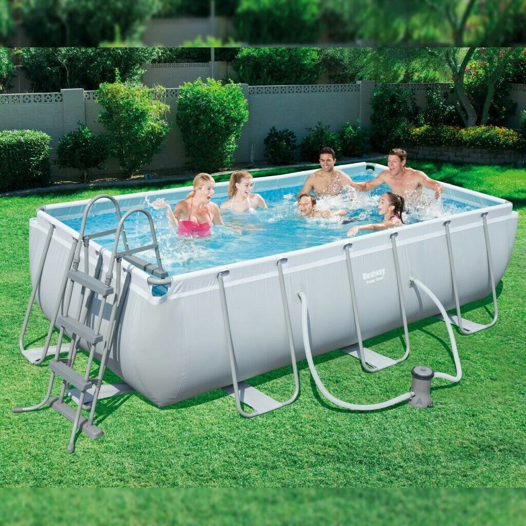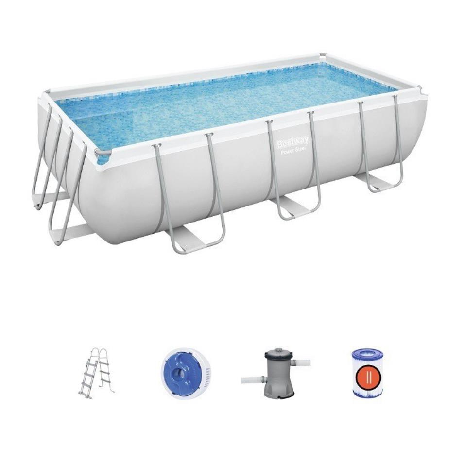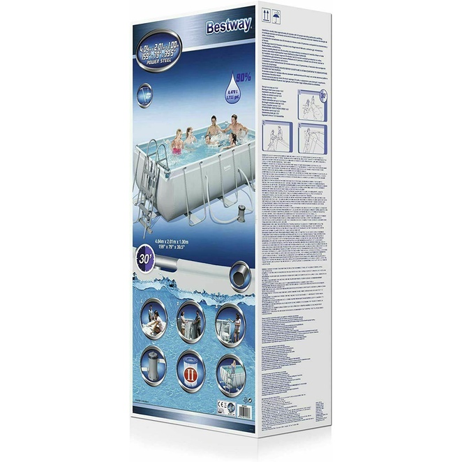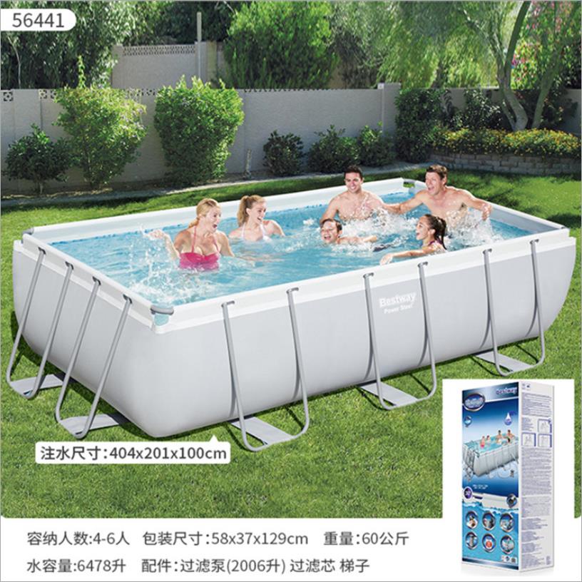 Make a splash with the BESTWAY Rectangular Stand-Up Family Swimming Pool Set with Pipe Frame. Made with high-quality PVC material and featuring a sturdy pipe frame, this pool set is perfect for outdoor recreational activities and swimming and wading sports. With a spacious size of 4.04 x 2.01 x 1.0m, there's plenty of room for the whole family to cool off and enjoy the water. This set includes an escalator for easy entry and exit, a filter pump for clean water, and a floater to help maintain water balance. Dive into fun and relaxation with the BESTWAY Rectangular Stand-Up Family Swimming Pool Set.