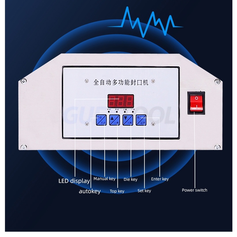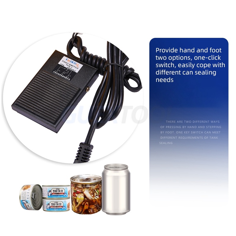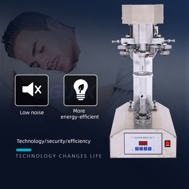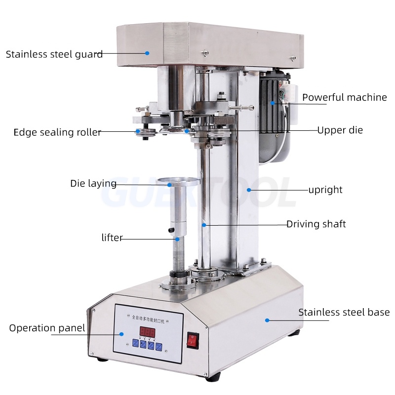 Product parameter Product Name: Automatic stainless steel can sealing machine Brand: RURIOO Power: 370W Voltage: 110V/220V Production capacity: 25 PCS/ min Adaptation range: can diameter 40-130mm, tank height 39-200mm Machine size: 300*550*800mm Machine weight: 65Kg Material: Stainless steel