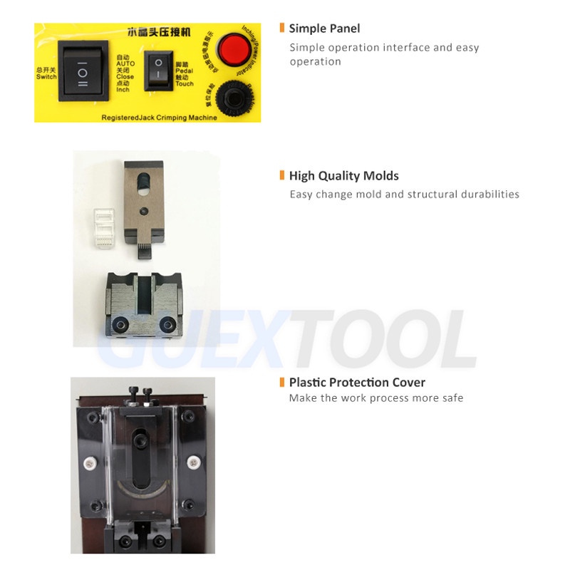 Brand Name: GUYX Product name: Crystal head crimping machine Power: 90w Working power: AC 220v/50hz Product weight: 15kg Applicable: 2p 4p 6p 8p 10p and UK connector Appearance size: 32*180*160cm