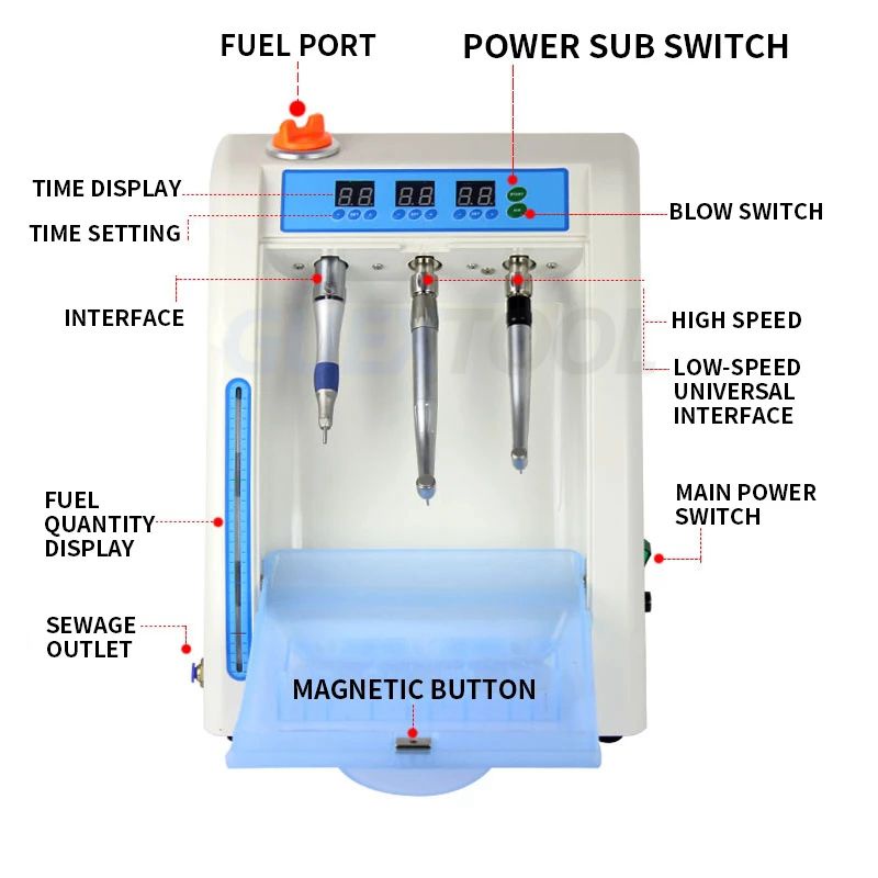 3. The air pressure reducing valve and pressure gauge are newly added, which is more convenient to control the working pressure, so that the machine can be cleaned and maintained under the rated air pressure.