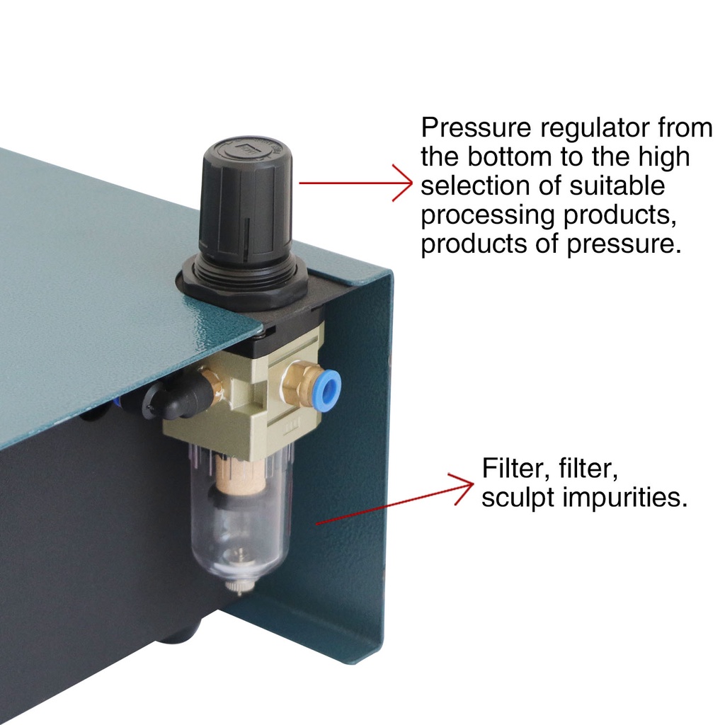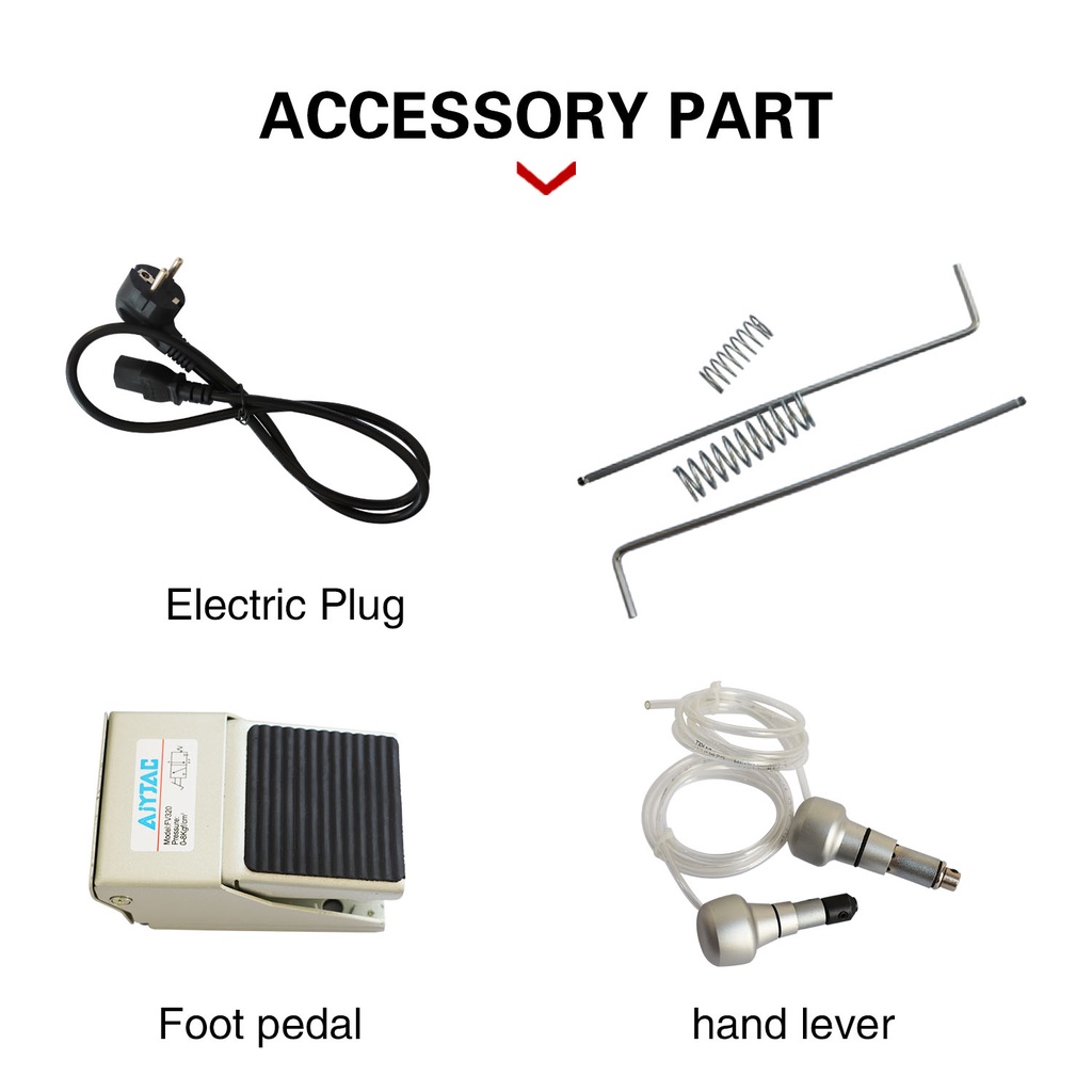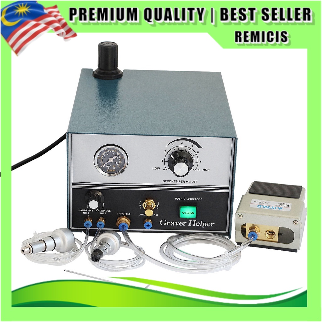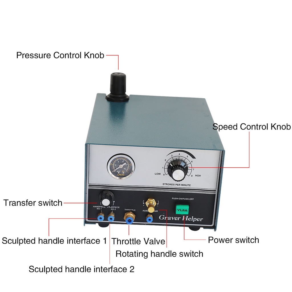 Description Pneumatic Engraving Machine 【Parameter】 - Voltage: 220V 50//60Hz; Power: 60W; Type: Double ended pneumatic; Speed: 0-4000 strokes/min; Air Pressure: 0-30psi; Gross Weight: 8kg; Size: 20.8*26.1*14.2cm 【Double Ended】 - This pneumatic engraving machine could be installed two engraving handpieces, you do not have to change the graver bits frequently. Please make sure the handpiece selector knob is correctly switched to the handpiece you want to use. 【Speed Adjustable 】 - The engraving handpiece can be freely controlled by the foot pedal. Vary the power input with the throttle to control the speed and depth of cut; And you also can adjust the stroke per minute to meet your engraving needs. It is very flexible, convenient and precise. 【Precise & Adjustable Regulator and Gauge】 - Equipped with pressure regulator and gauge, you can select the appropriate pressure from high to low speed for precise engraving, and read the pressure on gauge in time to ensuring better engraving effect. 【Wide Application】 - The pneumatic engraving machine fulfills the need for a machine capable of allowing rapid but precise cutting and carving of metal, stone, wood, and many other materials. The precise impact control feature of the machine also makes it an ideal tool for stone setting, stippling, matte finishing on jewelry, stipple engraving on crystals, etc.