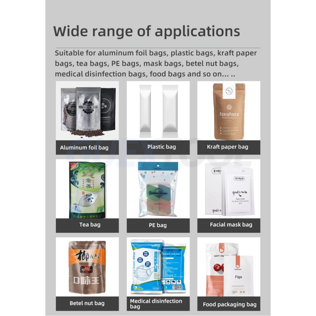 Suitable for aluminum foil bags, plastic bags, kraft paper bags, tea bags, PE bags, mask bags, betel nut bags, medical disinfection bags, food bags and so on... ..