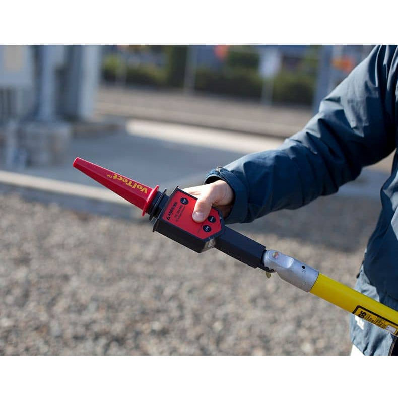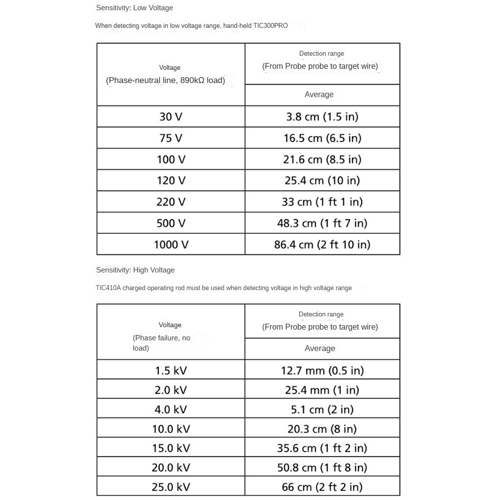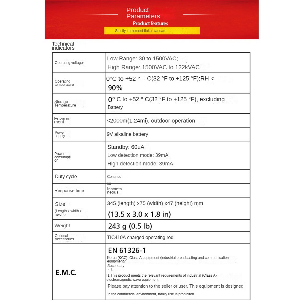 Technical Specifications: Operating Voltage: Low Range: 30 to 1500 VAC High Range: 1500VAC to 122KVAC Operating Temperature: 0°C to +52°C (32°F to +125°F); RH < 90% Storage Temperature: 0°C to +52°C (32°F to +125°F), battery excluded Environment: Operating altitude < 2000 m (1.24 mi), suitable for outdoor use Power Supply: 9V alkaline battery Power Consumption: Standby: 60 uA Low Detection Mode: 39 mA High Detection Mode: 39 mA Duty Cycle: Continuous Response Time: Instantaneous Dimensions (Length x Width x Height): 345 mm (13.5 in) x 75 mm (3.0 in) x 47 mm (1.8 in) Weight: 243 g (0.5 lb) Optional Accessory: TIC 410A Live Operation Pole E.M.C.: Complies with EN 61326-1 standards South Korea (KCC): Class A equipment (industrial broadcasting and communication devices)[1] (1) This product meets requirements for industrial (Class A) electromagnetic wave equipment. Sellers and users should take note. This equipment is designed for commercial use and is prohibited for home use.