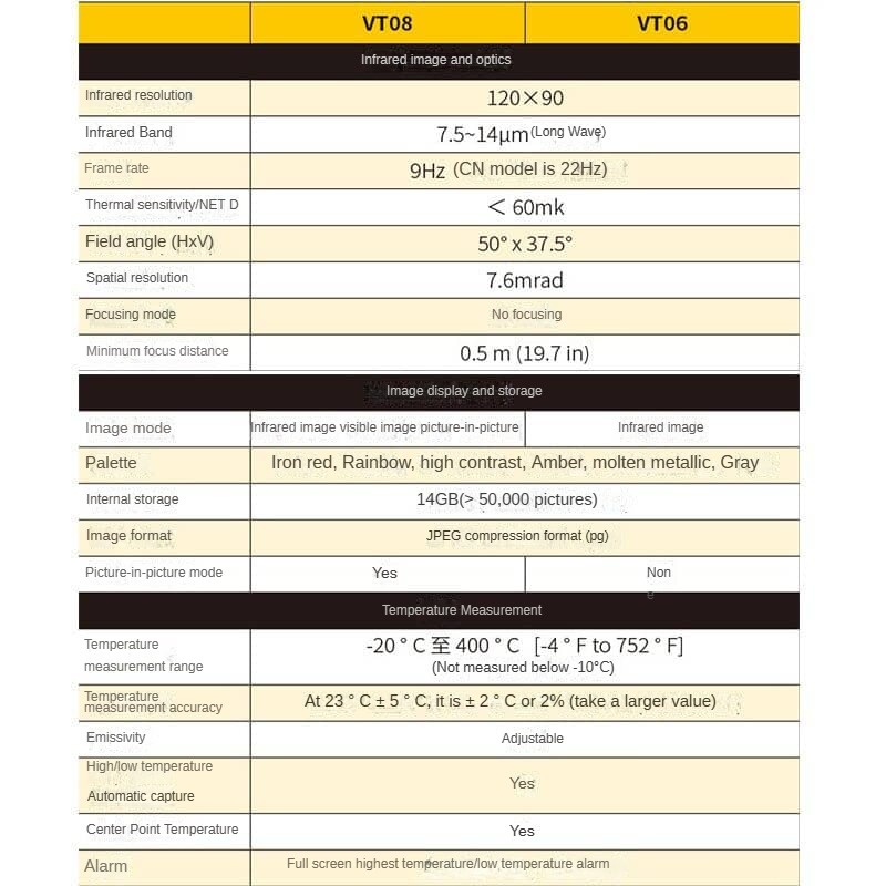 Color Palettes: Various color palettes available, including Iron Red, Rainbow, High Contrast, Amber, Molten Metal, and Grayscale.