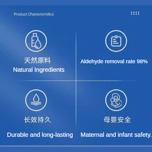 Produk ini adalah enzim yang terbuat dari protein tumbuhan yang telah dipotong menjadi rantaian. Ia dapat menyerap dan mengkalsium molekul dalam pelbagai pelarut organik dan mengkatalisis eliminasi bau beracun seperti formaldehid, toluena, xilena, dan TVOC. Rawatannya hanya sekali dengan hasil yang berpanjangan. Hanya perlu menyembur atau mengaplikasikan cecair tersebut sepenuhnya pada permukaan barang yang menghasilkan bau beracun. Produk ini tidak beracun, tidak berbau, dan tidak berwarna selepas mengering, menghilangkan kebimbangan tentang risiko toksik, pencemaran sekunder, atau perwarnaan semasa digunakan.
