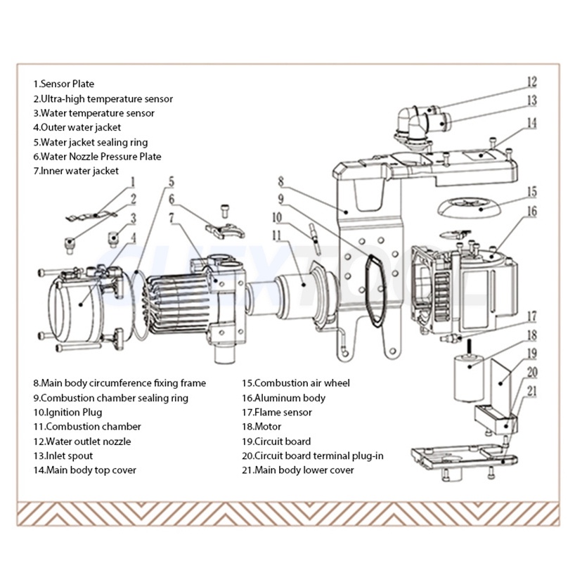 Rated heat flow rate: 5KW Fuel consumption: 0.55L/H Rated voltage: 9-16V Host size: 230 * 90 * 165mm Host weight: 2.3kg Power consumption:<39W Applicable fuel: diesel/gasoline Outer box size: 470 * 330 * 310mm Outer box weight: 7.2kg Remote control distance: obstacle free 600m Remote control distance: 200m with obstacles