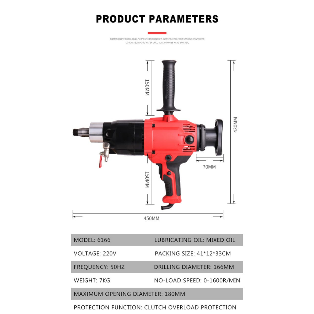 Model: 6166 Voltage: 220V Frequency: 50Hz Weight: 7KG Lubricating oil: mixed oil Packing size: 41*12*33cm Drilling diameter: 166mm No-load speed: 0-1600r/min Maximum opening diameter: 180mm Protection function: clutch overload protection