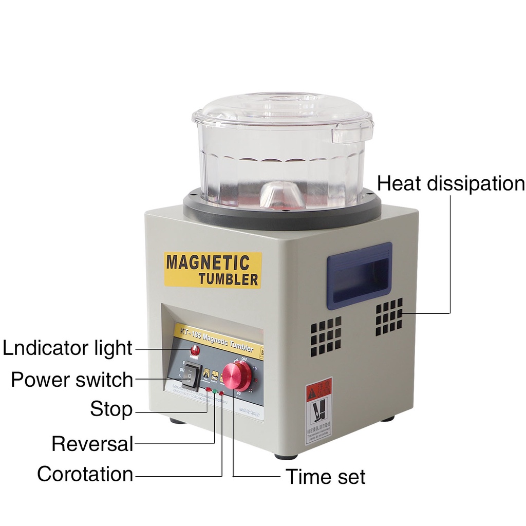 Magnetic tumbler voltage: 110v/ 220v Power: 250W; Burnishing pins: 200g #5; Time control: 2-30 minutes; Two directions