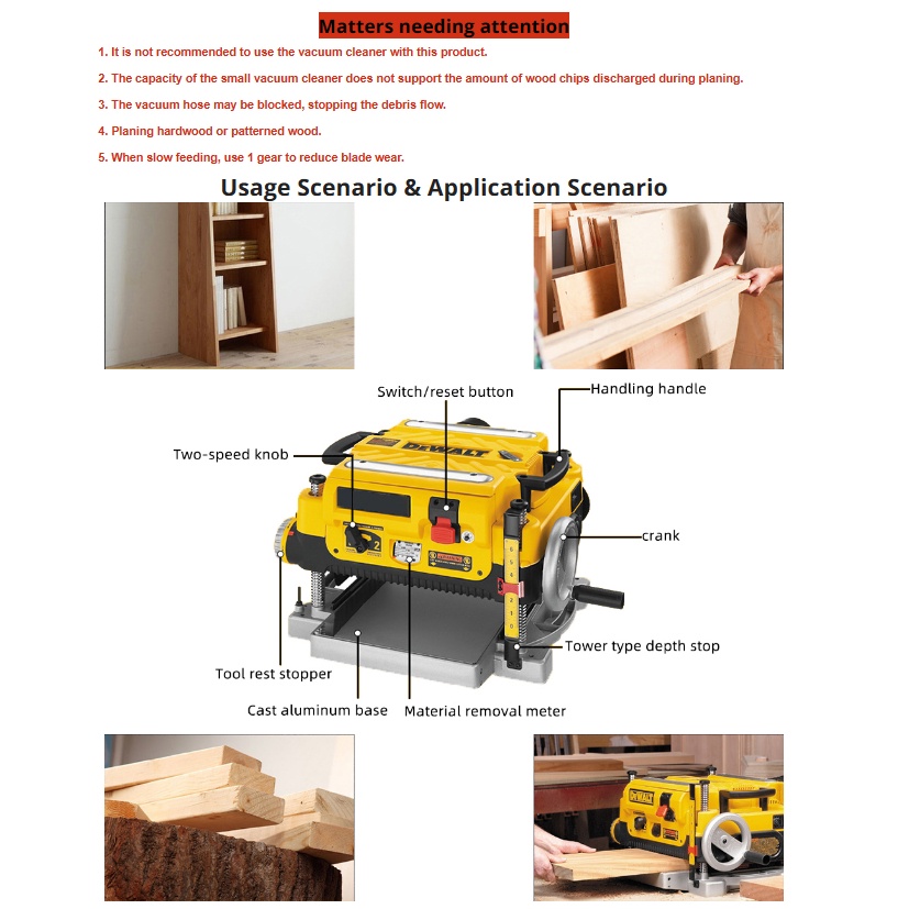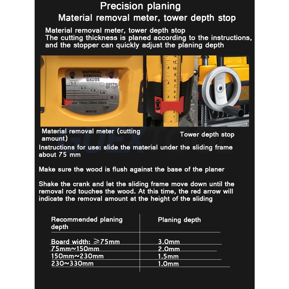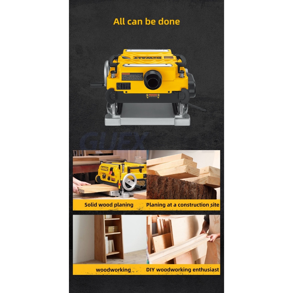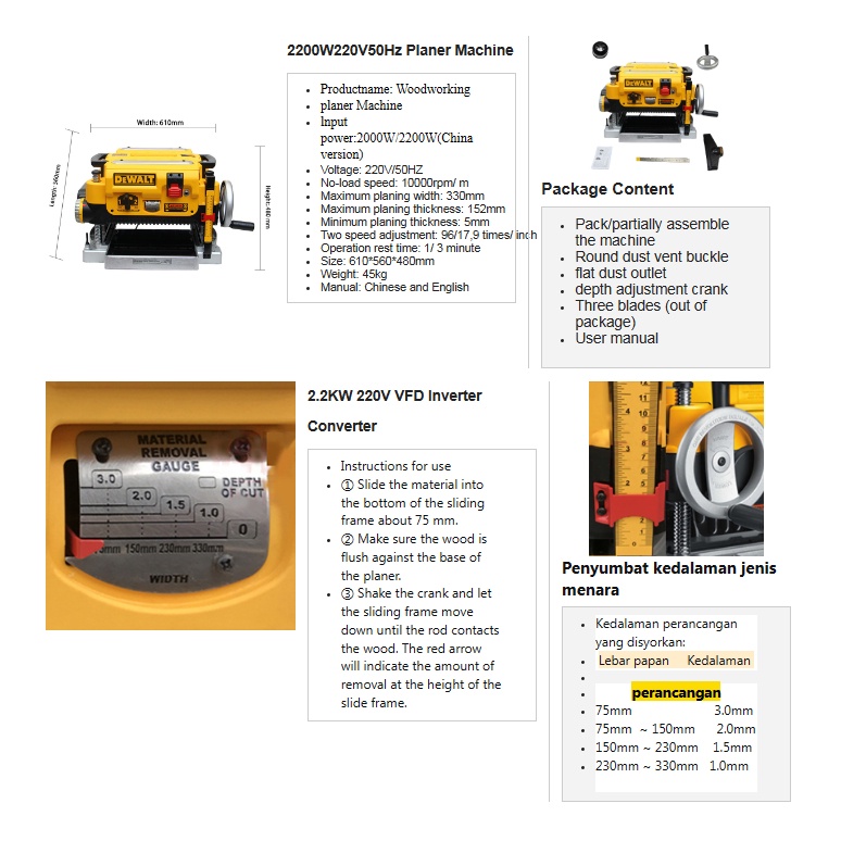 Productname: Woodworking planer Machine lnput power:2000W/2200W(China version) Voltage: 220V/50HZ No-load speed: 10000rpm/ m Maximum planing width: 330mm Maximum planing thickness: 152mm Minimum planing thickness: 5mm Two speed adjustment: 96/17,9 times/ inch Operation rest time: 1/ 3 minute Size: 610*560*480mm Weight: 45kg Manual: Chinese and English