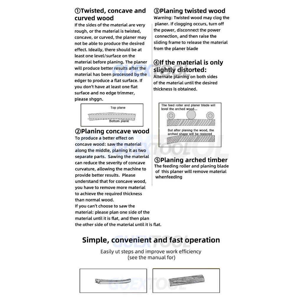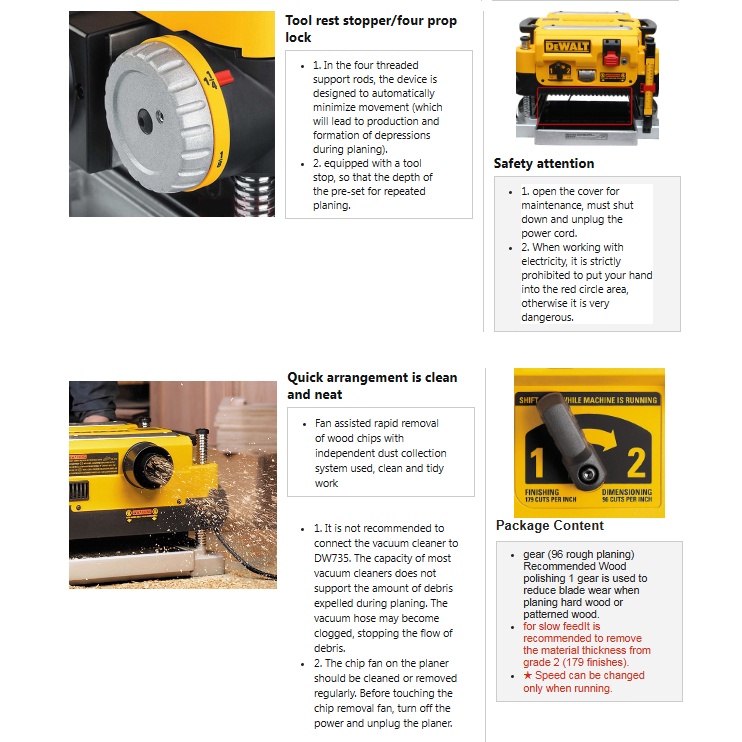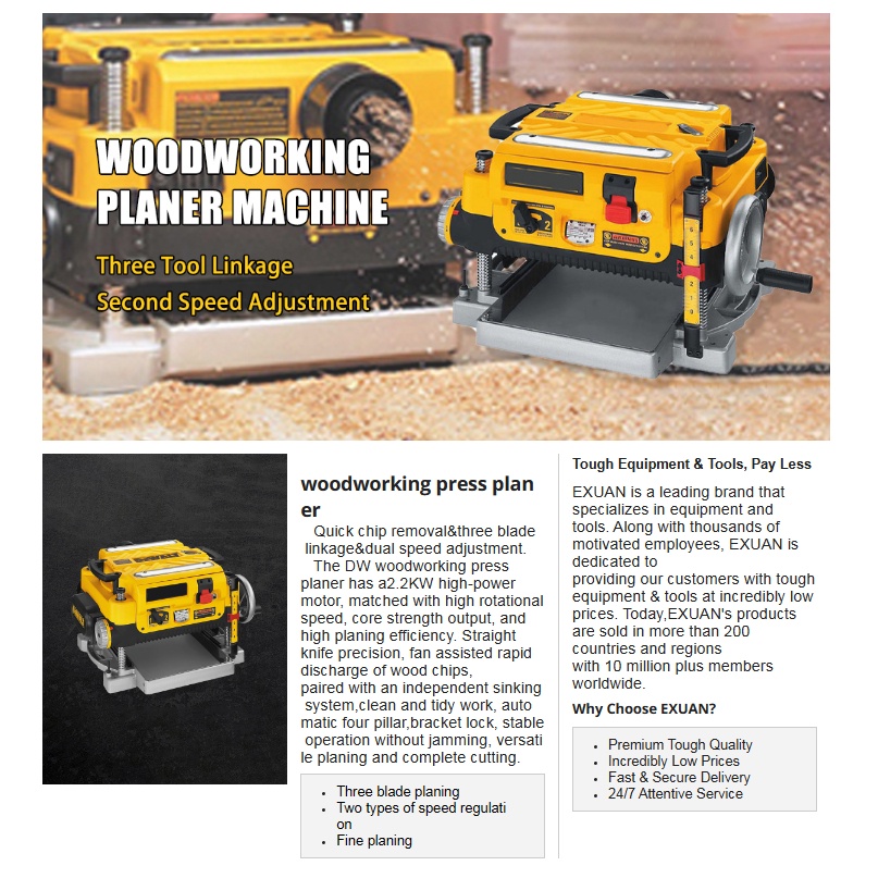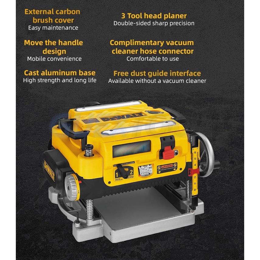 Productname: Woodworking planer Machine lnput power:2000W/2200W(China version) Voltage: 220V/50HZ No-load speed: 10000rpm/ m Maximum planing width: 330mm Maximum planing thickness: 152mm Minimum planing thickness: 5mm Two speed adjustment: 96/17,9 times/ inch Operation rest time: 1/ 3 minute Size: 610*560*480mm Weight: 45kg Manual: Chinese and English