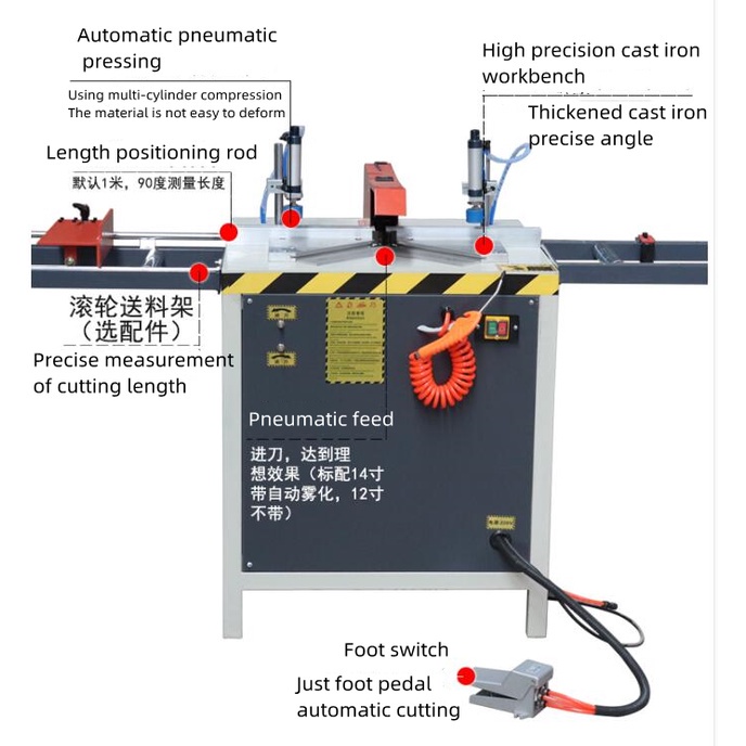 Pneumatic Multi-function Door And Window Aluminum 45 /90 Degree High Precision With Angle Guard Sliding Door Angle Cutting Aluminum Alloy Machine 14inch parameter Saw blade angle: 45/90 degrees Use voltage: 220V Power: 2.2kw Speed: 5000RPM/min Saw blade specification: 355x25.4x3.2x120T 90 degree cutting: cutting height 96mm / cutting width 208mm 45 degree cutting: cutting height 116mm / cutting width 216mm Dimensions: 695x695x953mm